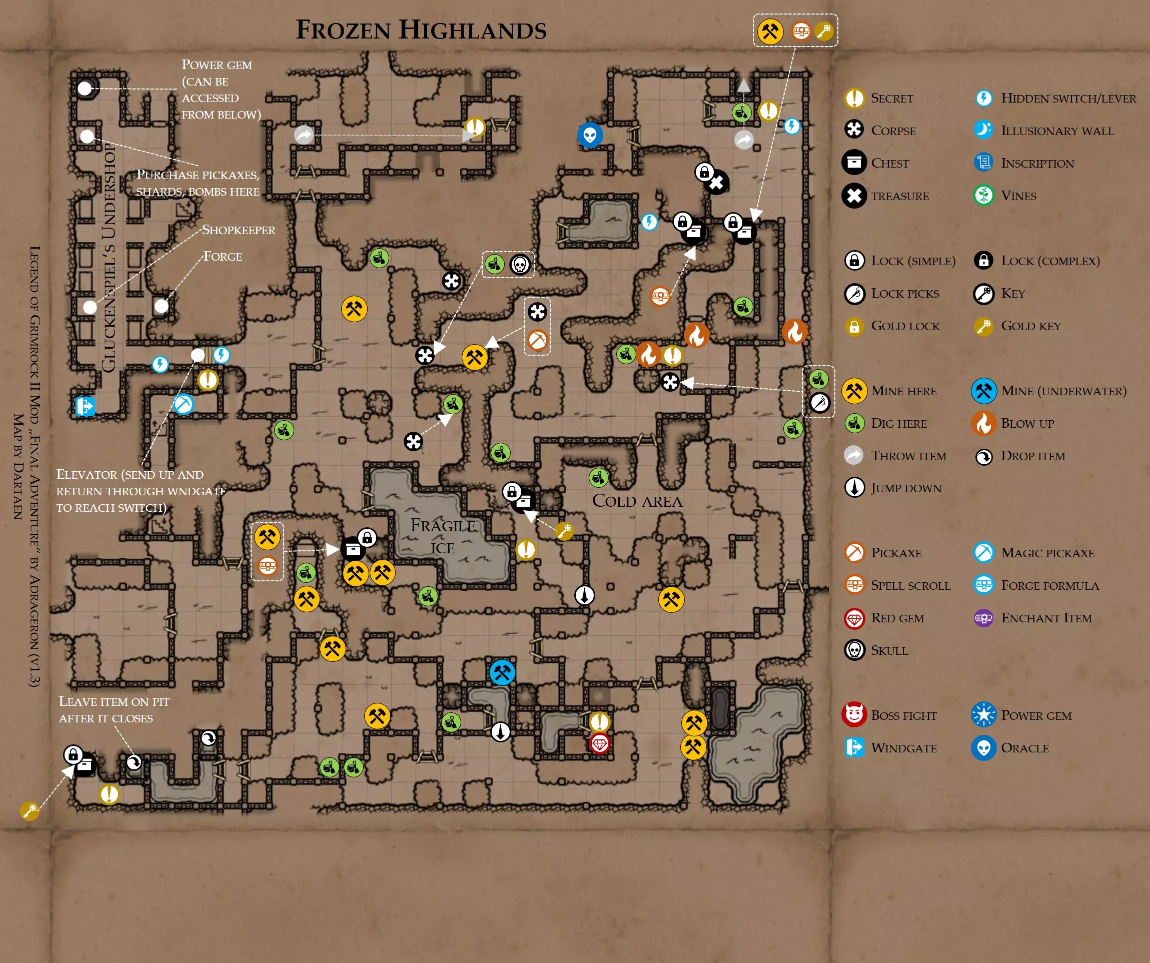 提示 Boss战:蜂巢会不断生成食腐者,直到被摧毁。尝试用炸弹快速消灭它们。食腐者会麻痹你的角色,所以也要准备好应对麻痹的物品。 地图 - 冰封高地与碎镐矿洞 区域要点 该区域有格鲁肯斯皮尔地下商店,可用宝石购买碎片、炸弹和魔法镐。花费一把金钥匙,你还能获得【工兵手册】(允许用火炸弹炸开塌方)和【矿工指南】(采矿时减少一半饥饿值消耗)。你还会在这里找到锻造炉,可用于制作物品(需拥有配方和材料)。 你需要耐寒能力。冰封高地 关于该区域 当你攀登山脉时,在某个位置(寒冷区域)天气会变得极度寒冷,导致你每隔几秒就会受到寒冷伤害。若你的寒冷抗性达到50或更高,则不会受到伤害,因此要始终保持【冰霜护盾】(同样可在此区域找到)处于激活状态。 格鲁肯斯皮尔出售一颗能量宝石,售价为10个铜矿石。你可以在下方的矿脉中寻找铜矿石,或者从他那里偷走能量宝石。若选择后者,你需要15个火焰炸弹,但这样就能保留铜矿石用于锻造。