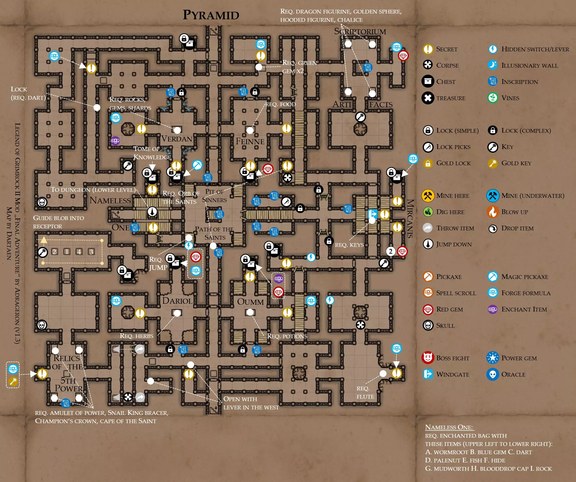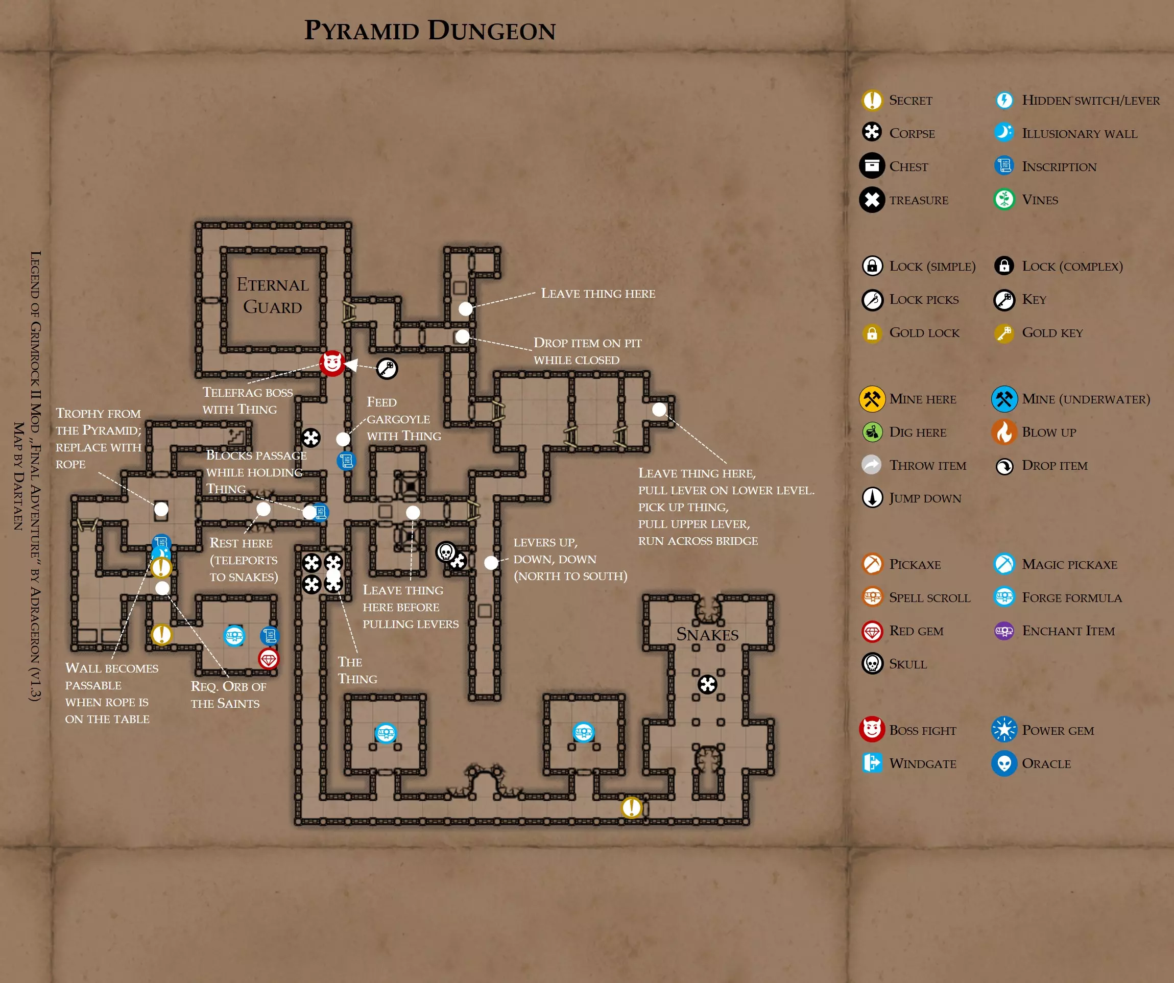 提示 如果你拥有从乌尔霍尔德要塞获得的【毁灭之杖】,可以用它来摧毁【活石守望者】。这会触发一场 boss 战,并且能让老贝莱思相当满意。 一旦你重铸了精华,图书馆就可以进入了。 地图 - 金字塔及金字塔地牢 此处行动指南 金字塔可以从水晶湖和燃烧沙海两个方向进入。你必须使用这两个入口才能解锁中央区域。 你的目标是找到通往金字塔地牢的路,地牢中藏有金字塔的【战利品】(这正是活石守望者想要的物品)。你需要从活石那里获得【圣徒之球】。 你必须在各个神的祭坛上献祭不同种类的物品(宝石/碎片、食物、草药和药水)。要打开中央走廊的大门,至少需要献祭一件物品;献祭更多物品则会开启每个房间相邻的两个秘密区域。尽量献祭不同类型的物品,而非重复献祭同一件物品,神明喜欢多样性。 盗贼之神米尔卡尼斯希望你献祭钥匙——最好是非开锁器的钥匙。记住,当你拥有开启复杂锁具的能力(在芝士汉堡处获取该特性)时,使用足够数量的开锁器几乎能打开任何锁。这样你就能为米尔卡尼斯节省一些钥匙。同时记住——米尔卡尼斯也喜欢多样性。 金字塔 关于此区域 你需要圣徒之球(从活石区域获得)才能完成此关卡。此关卡包含五个祭坛,你需要向远古神明献祭物品。至少进行一次献祭才能开启前进的道路。若要获取所有秘密,则需要献祭更多物品,因此请随身携带一些装有食物、药水、草药以及宝石/碎片的容器。尽量不要携带超过一到两个相同类型的物品——神明喜欢多样性。献祭时需谨慎——这些物品将永久失去! 金字塔有两个入口:一个来自水晶湖,另一个来自燃烧沙原。你必须使用这两个入口才能解锁所有区域,并从中央区域(圣徒之路/罪人深渊)进入金字塔地牢。 其中一个秘密需要四个第五力量圣物(这些物品能为所有属性+5)。如果你按照推荐顺序探索地图,现在应该已经找到或制作出所有这些物品了。另一个秘密需要来自【文书馆】的4件神器(那些藏在金色锁后面的物品);如果你还没有这些,现在就去获取它们。 此外,还有两个秘密祭坛,其中一个需要你献祭钥匙。只有当你从【芝士汉堡】那里获得了【复杂开锁】特性后,才应该献祭钥匙,否则你可能会在游戏后期陷入困境!