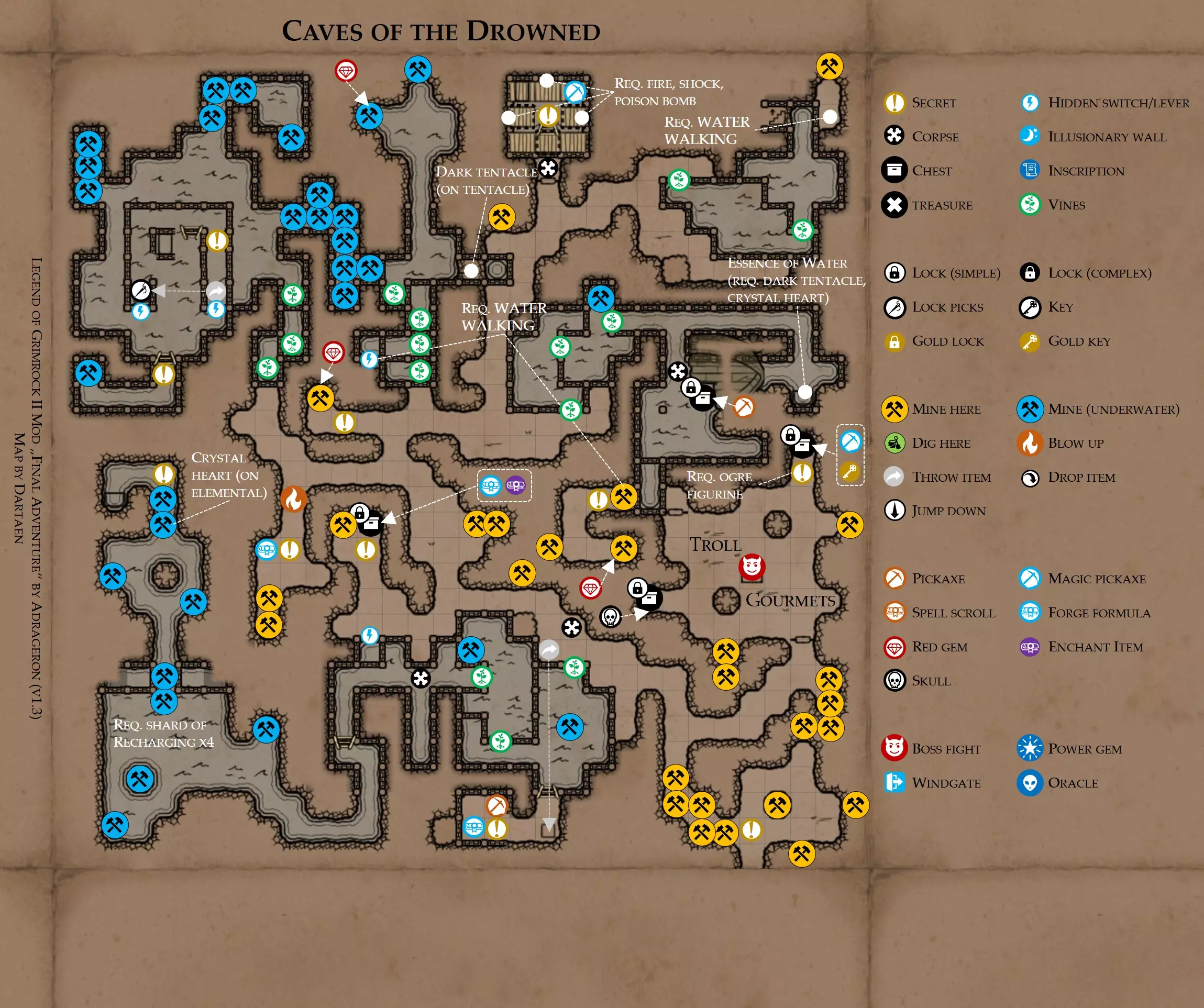 提示 黑市和宝石商人处藏有一些非常隐蔽的开关,部分被墙上的石架遮挡。 洞穴 关于此区域 东北部分只能从溺水洞穴进入。你要到很久之后才能到达那里。 包含远古遗物,可施展水下呼吸法术。不过使用几次后需要充能。