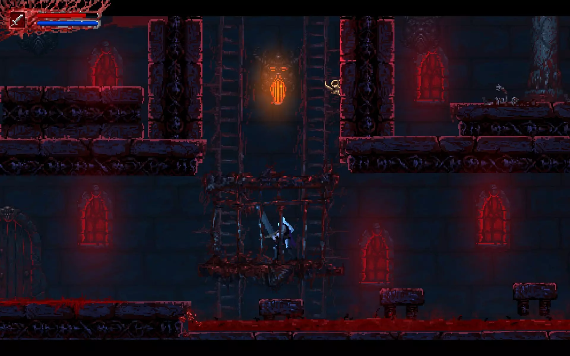 在有两部升降机的地方,乘坐第一部升降机后向左穿过墙壁。守卫——两只女妖。 城堡桥