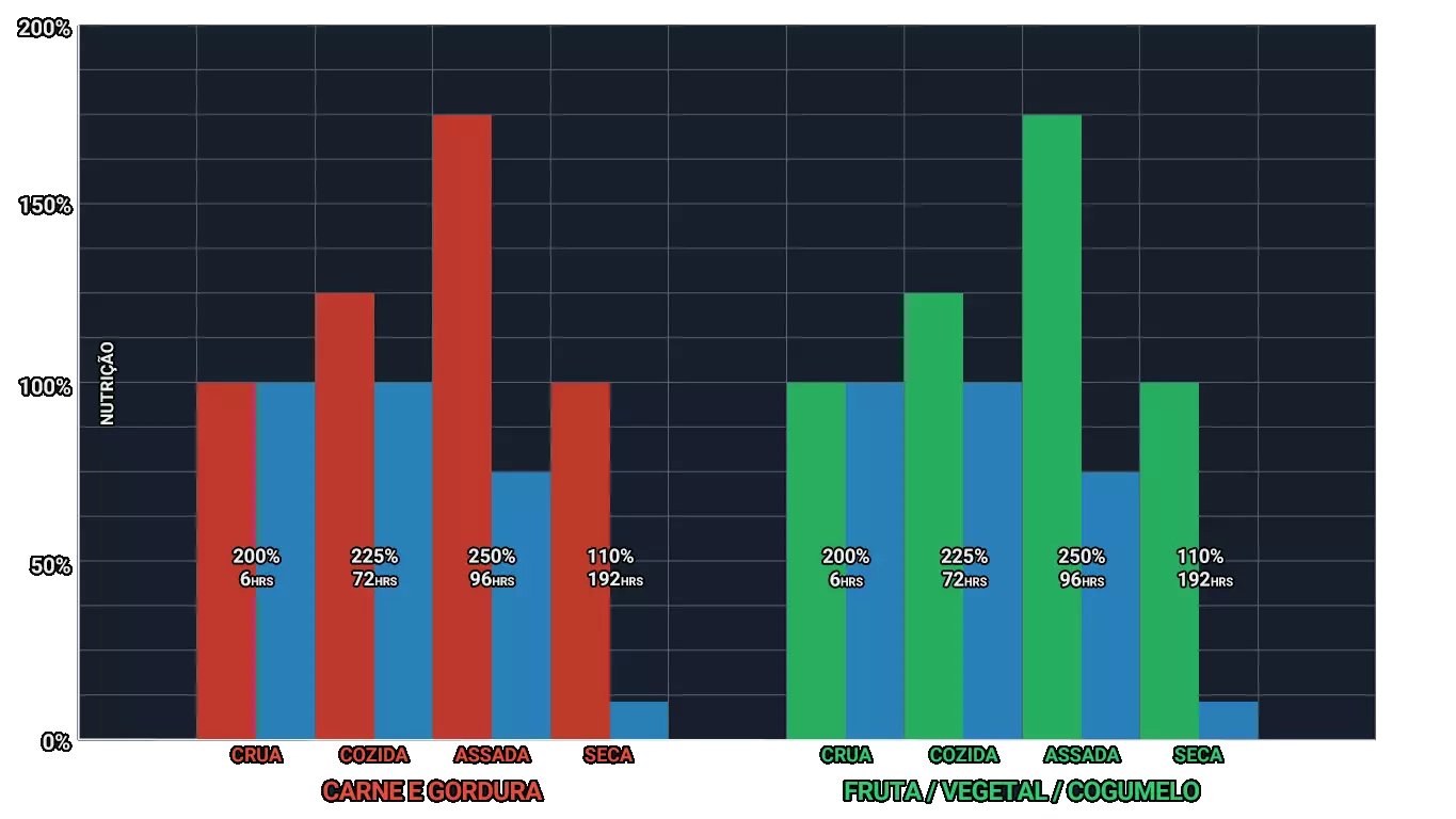 图表 此图表展示了每种食物制备方式下的【能量+水分】百分比以及食物变质所需的时间。