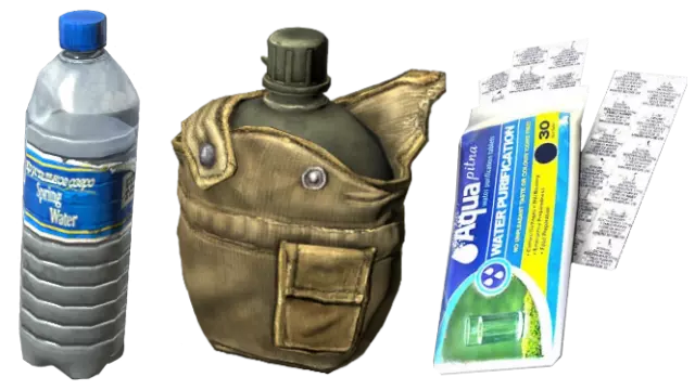 一些衣物或工具可以在水泵处找到。 若要对水进行消毒,你可以使用氯片(Chlorine Tablets)或将水在锅中煮沸。在地图上或僵尸尸体上找到的盛水容器有50%的几率受到污染,必须更换为饮用水或进行消毒后才能安全饮用。汽水始终总是可以安全饮用用的。