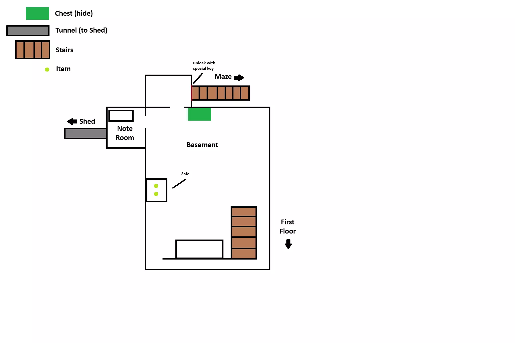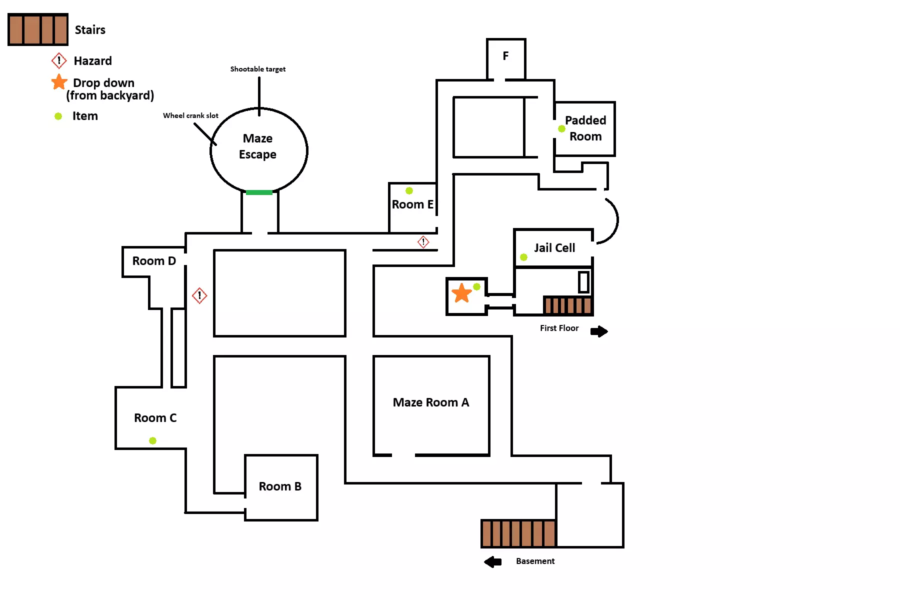 迷宫A房间内有一张图片碎片。 监狱牢房旁的桌子上放着汽油罐。 迷宫C房间内有VHS录像带。 迷宫D房间内有汽车车轮。 软垫房间内有万能钥匙。 电线盒位于通往监狱牢房的隧道对面。 地图种子B 一楼种子B