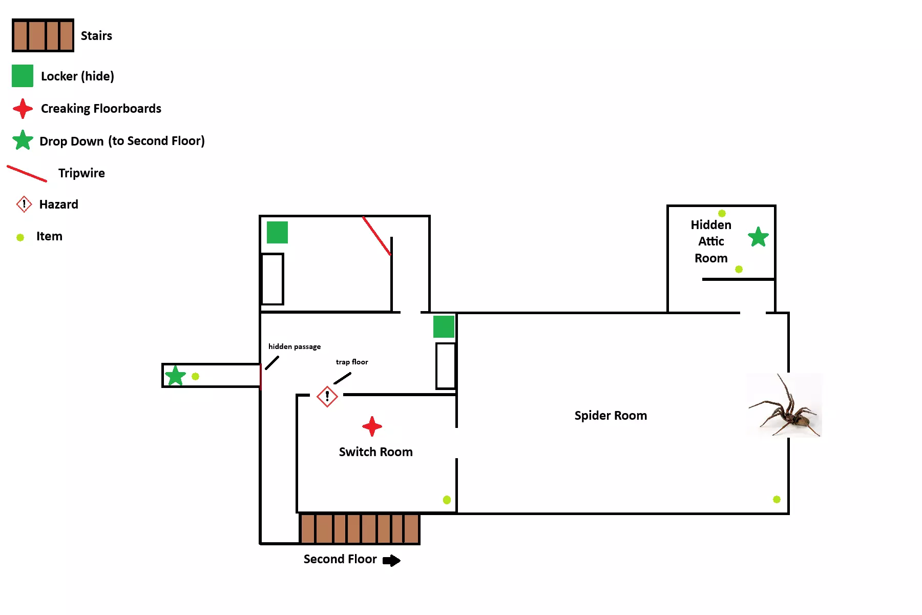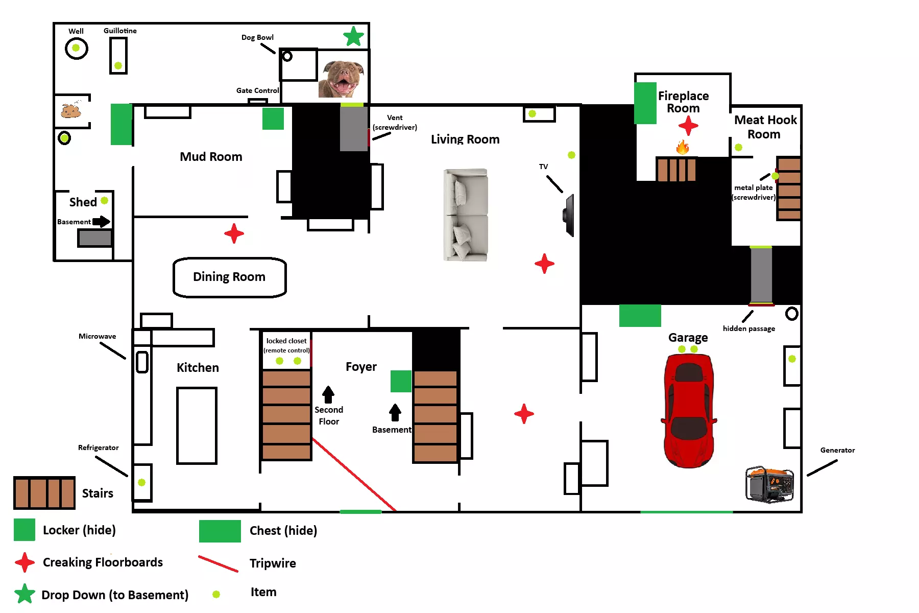 《Granny: Escape Together》地图布局与物品刷新点综合指南。地图比例非实际尺寸。 地图 一楼