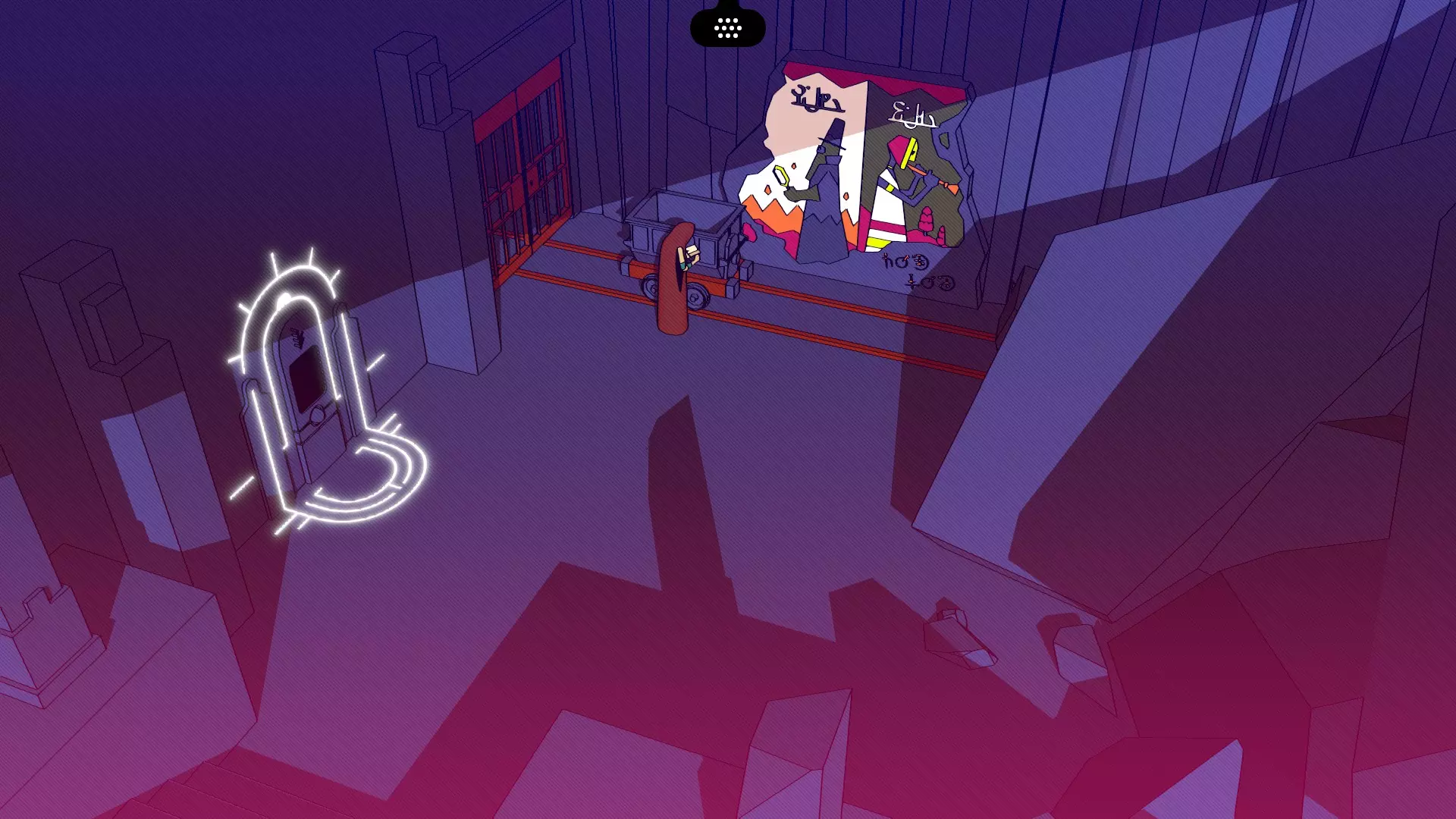 我们复数的寻找 在乘坐电梯上去之前,进入洞穴。在那里,推动矿车并查看壁画。