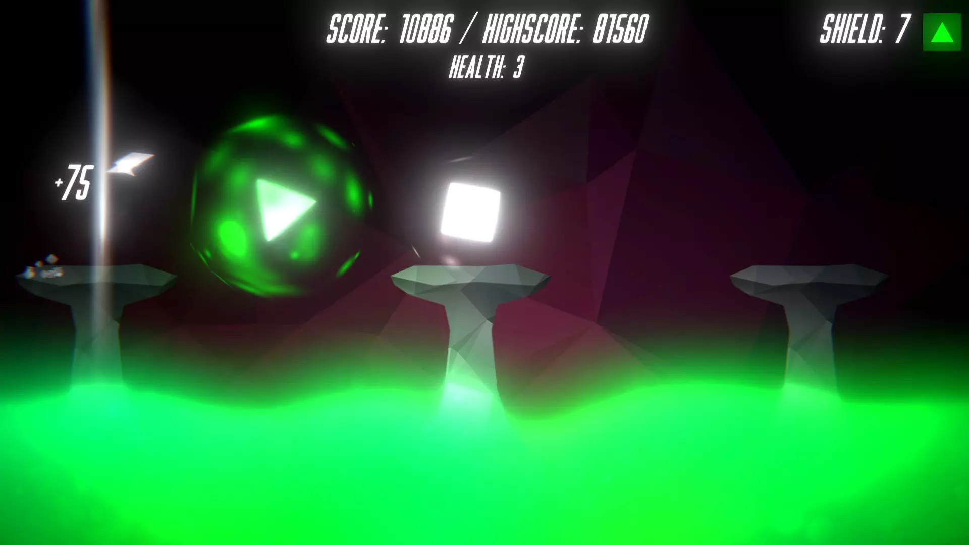 我现在正在跳跃,方块已经向我发起攻击,但因为我拾取了护盾,这次攻击没有杀死我,也没有对我造成伤害。我有3条生命值,即便我没有护盾且被方块击中,也不会获得成就,因为那不会导致死亡和游戏结束,游戏会以2条生命值继续进行。