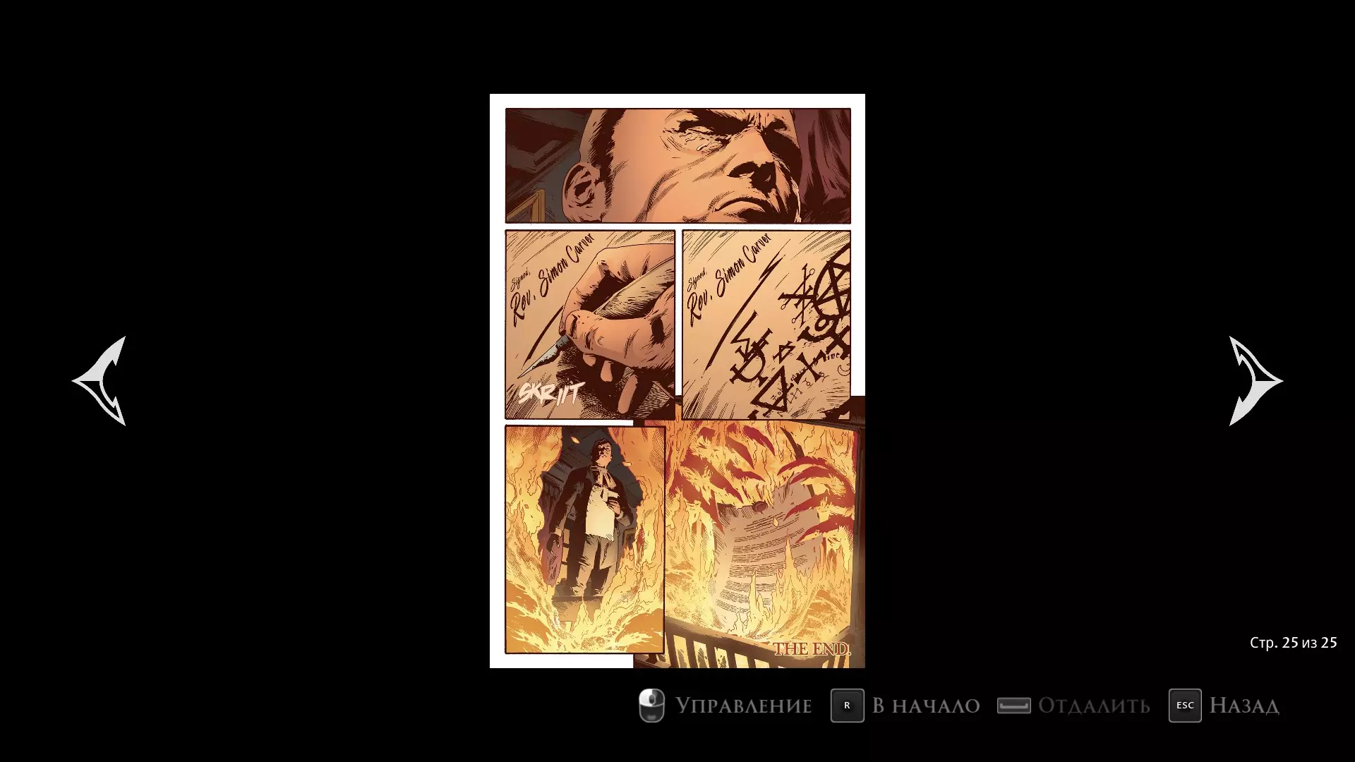 这是一部相当不错、充满温情的漫画,在我看来,它进一步展现了主角的性格。我唯一还想指出的一点是漫画中心理医生的形象。在游戏中,安东尼所看到的所有幻觉都基于他认识或遇到过的真实人物。而我们在漫画中看到的心理医生,也很可能是基于安东尼认识的某个人。我猜想,既然我们的主角此时已经没有记忆问题,并且非常清楚自己的真实身份,那么漫画中的女孩可能完全基于真实人物。也许这就是真正的安东尼的心理医生,或者至少曾经是。但这只是我的猜测,是否认同由你决定。 现在我们来看第二本漫画。故事讲述了卡弗如何给怀曼法官写一封感谢信。在信中,这位神父忏悔道,由于自己的迷茫和偏离正道,他将无辜的人们推向了死亡。他承认自己犯下了巨大的罪孽,如今他的灵魂将永远被诅咒。而且,不仅仅是他自己。在卡弗看来,所有因他而死的人也都将被诅咒。他们将和神父一起在小希望镇遭受永恒轮回的惩罚,不断重生并重复自己的罪孽,直到这些罪孽得到救赎。这一切都是卡弗在信中所叙述的,信的最后他将其烧毁,因为他明白,如果这封信落入他人手中,自己将面临死亡。