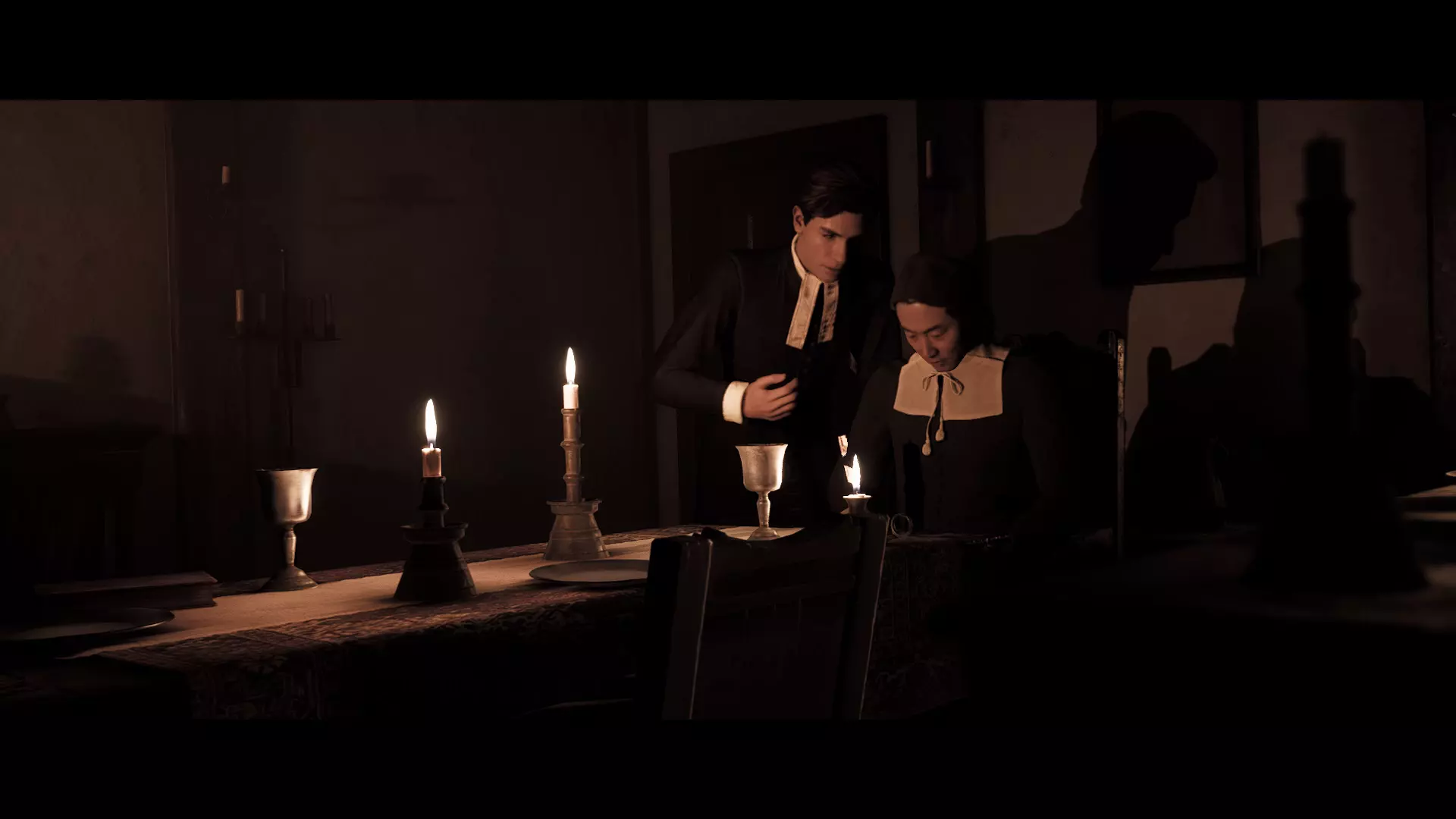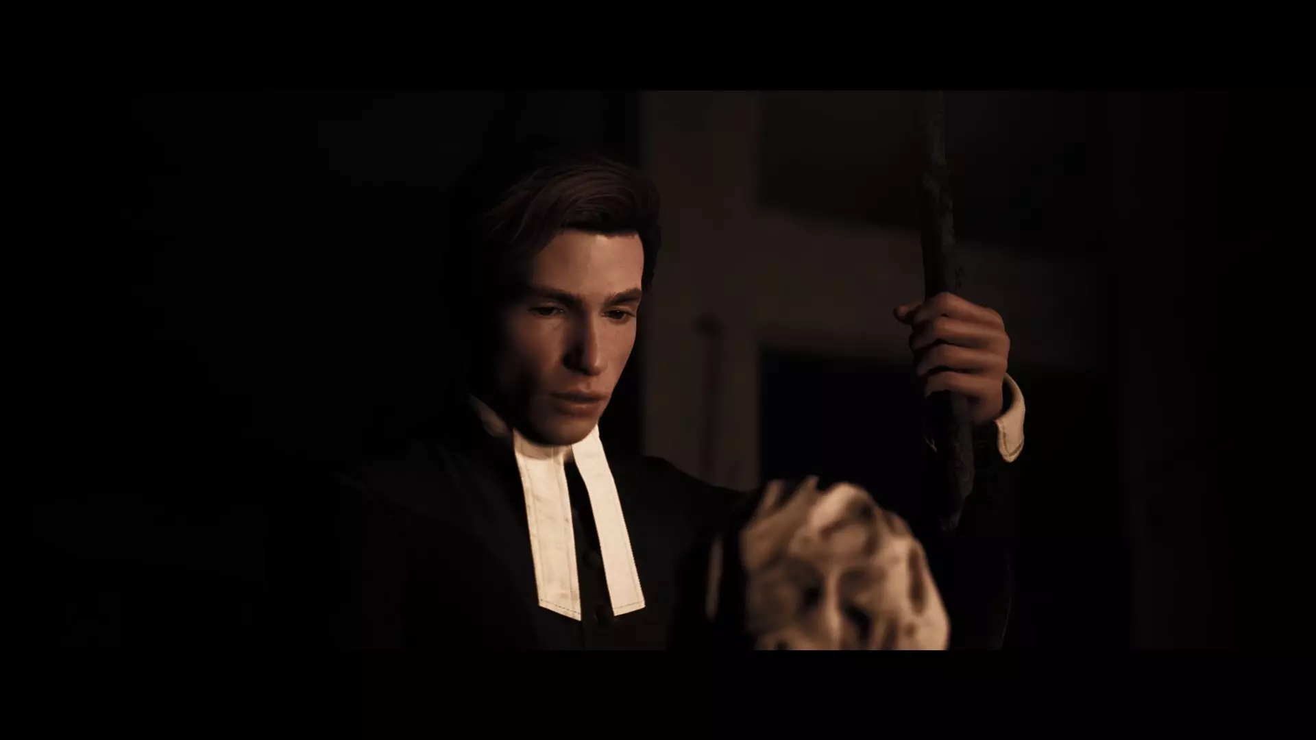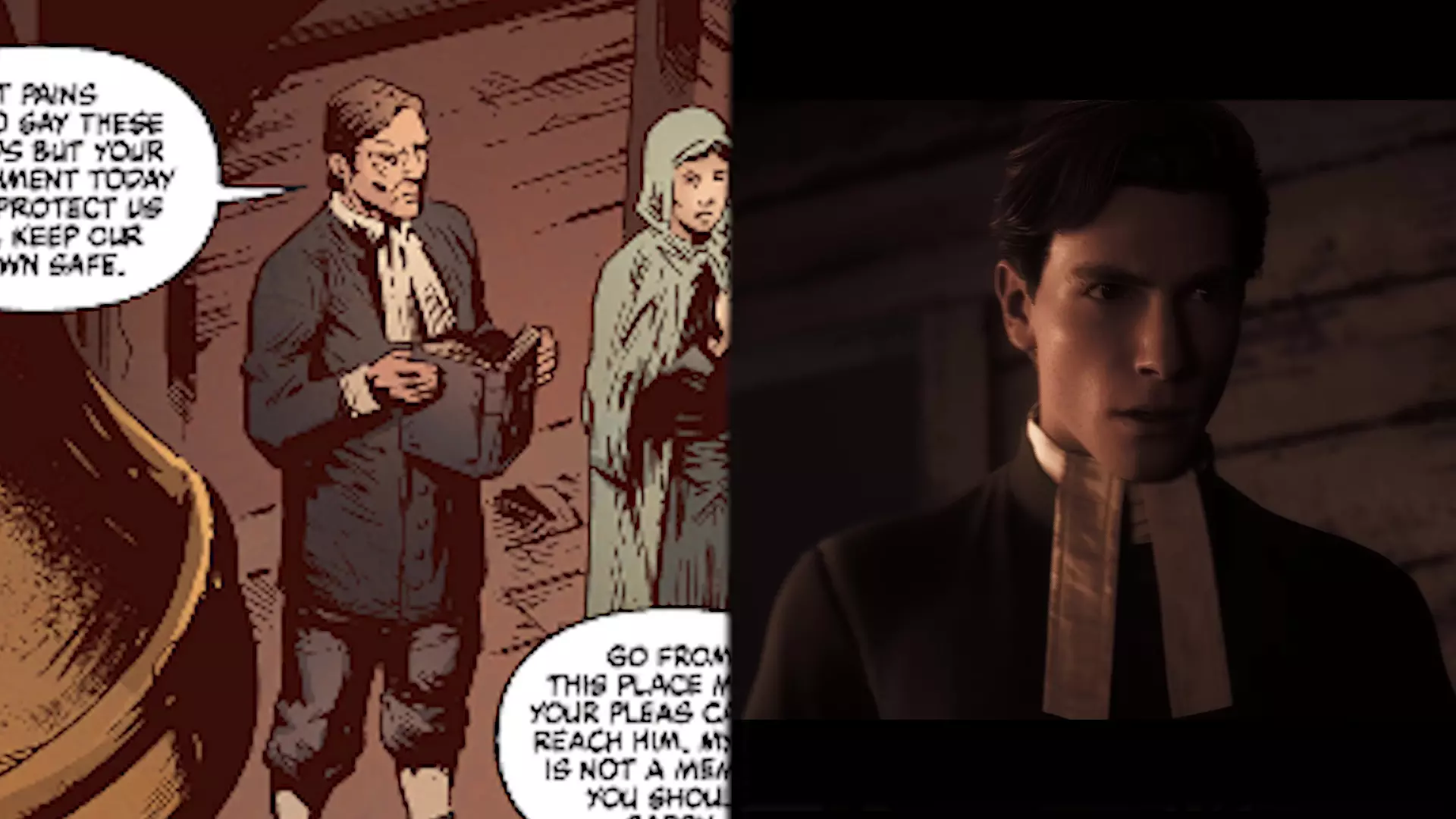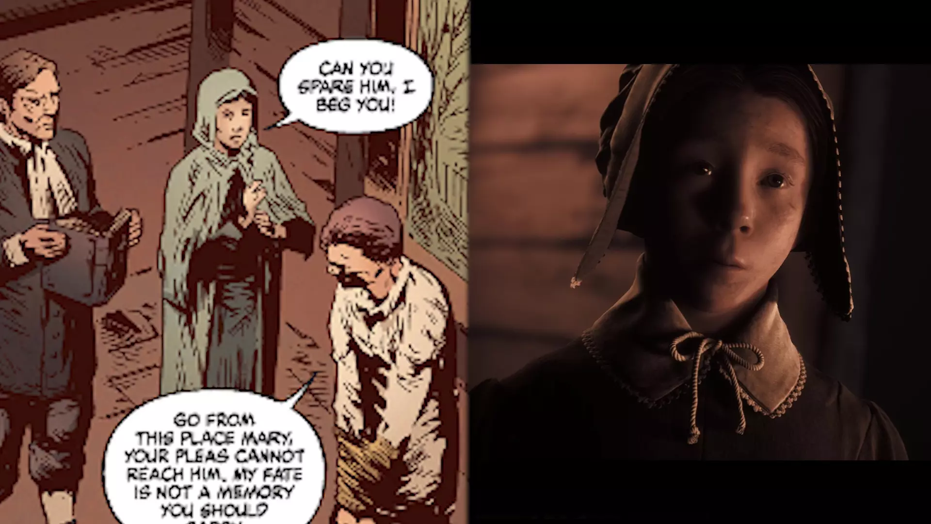 我多次回看了游戏中的这个片段,但无论如何都看不到女孩脸上的笑容,所以要么是他看错了,要么就是她在镜头没有拍到她脸的时候笑了。如果是后者的话,那么玛丽或许确实对姐姐心怀不满,并且对她的死感到高兴。但就我个人而言,我并不相信这种说法,我仍然觉得是亚伯拉罕看错了。但无论如何,塔比莎还是被处决了,玛丽只能由她的哥哥大卫照顾。但这也没持续多久。一段时间后,大卫去了教堂,在那里,我们的主角们以鬼魂的形态出现在他面前。大卫友好地开始和他们讨论他妹妹的行为。但不幸的是,就在这时,卡弗带着玛丽走进了教堂。神父听到大卫在和谁说话,但教堂里除了他之外明明空无一人,于是便斥责女孩的哥哥,仿佛他在与邪灵交流。而玛丽则真心为她善良的哥哥感到害怕,并试图保护他——这是她当年没有为塔比莎做过的事。她说,那人曾与邪灵交谈,试图摆脱它们,但卡弗根本不相信她的话,还指控大卫是魔鬼的帮凶,因此法庭也判处大卫死刑。不久之后,米尔顿家族最后一位在世的成年人被带到教堂的钟楼,他们打算在那里将他处决。在那里,玛丽再次试图劝说卡佛饶她弟弟一命,但这些恳求对铁石心肠的神父毫无作用。他没有改变决定,在他的命令下,治安官将大卫从钟楼推了下去,大卫径直摔在了尖桩栅栏上,此后玛丽成了她家中唯一的幸存者。