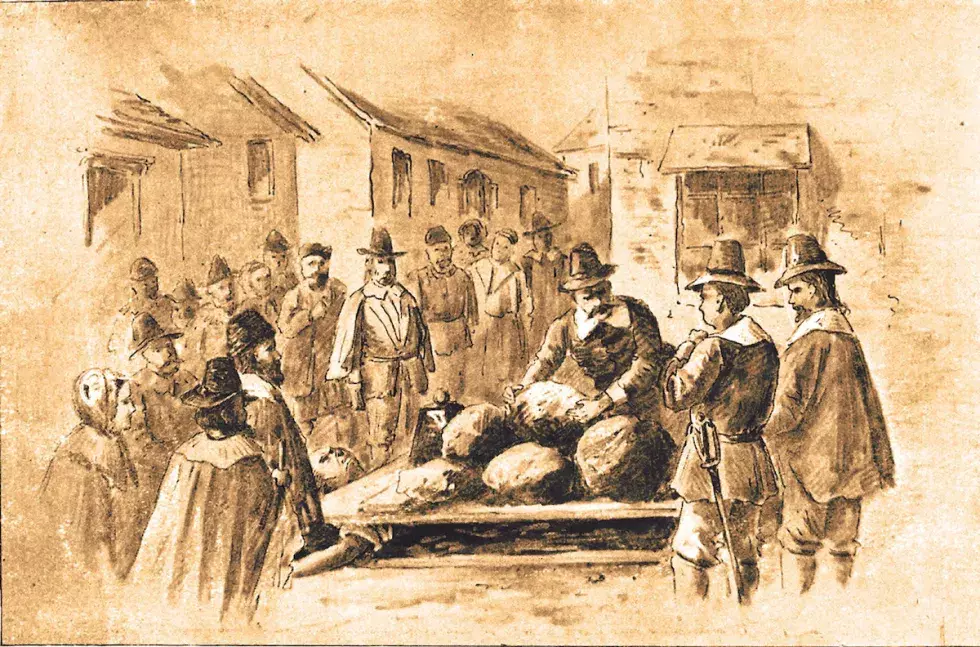 神父的这番话确实对法官产生了影响,所以当他听取了亚伯拉罕对其受监护人的担忧后,便听从了神父的意见,将女孩的监护权交给了他。 而由于亚伯拉罕的话未能对法官产生预期效果,约瑟夫最终还是很快被处决了。而且,在我看来,他的处决方式相当残酷,这种方式被称为【痛苦与严厉的刑罚】。在俄语中,这被翻译为“强烈且持续的折磨”。这是一种古老的酷刑,曾在英国用于那些不愿与法庭合作的人。在塞勒姆女巫审判期间,确实有一个案例,有人因被怀疑与魔鬼勾结而遭受这种刑罚。一名八十岁的老人遭受了整整两天的这种折磨,目的是让他出庭受审。但老人只是请求多添些石头,好快点死去,因为他不想作证,以免他的家人失去他所拥有的农场。