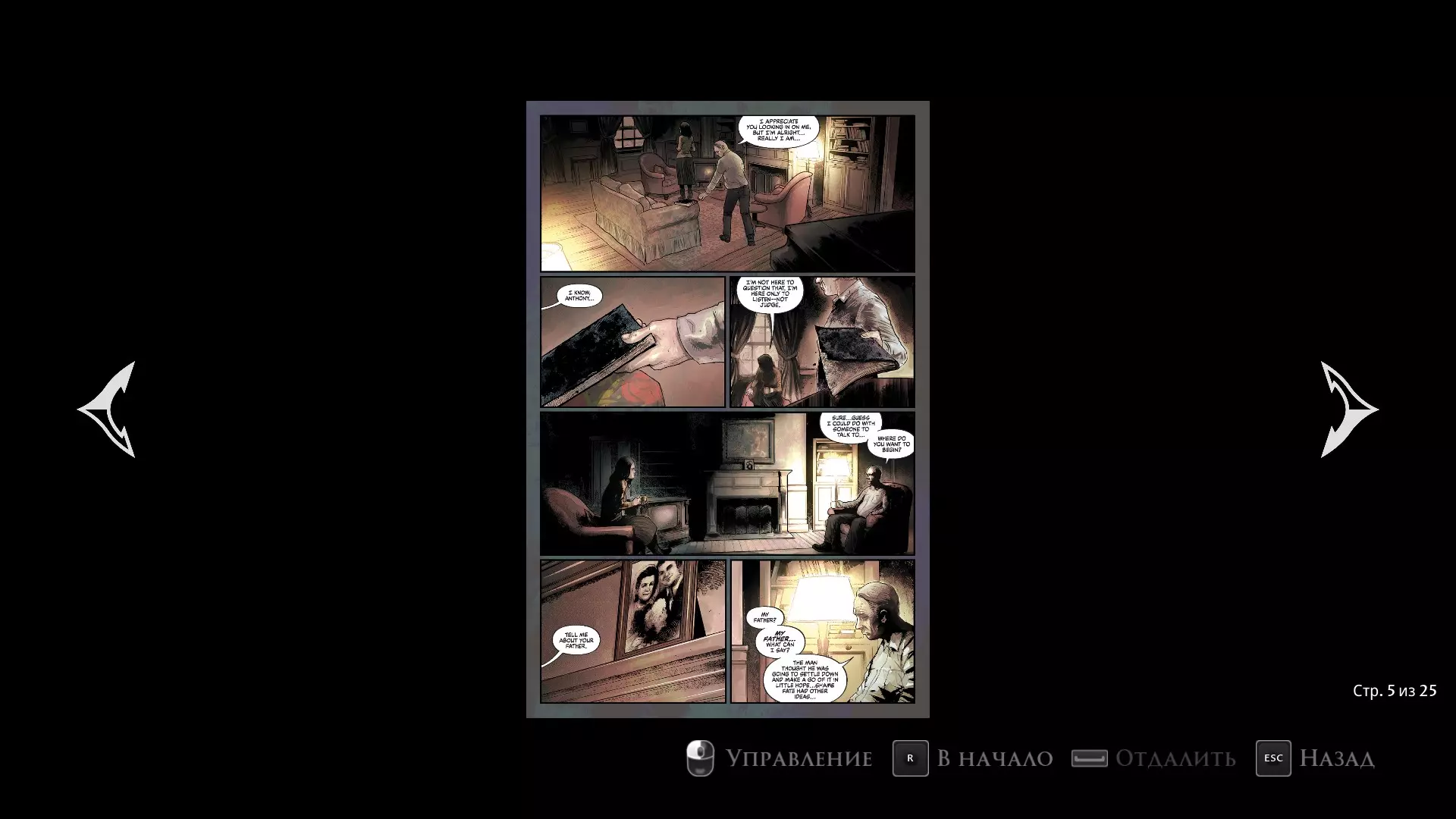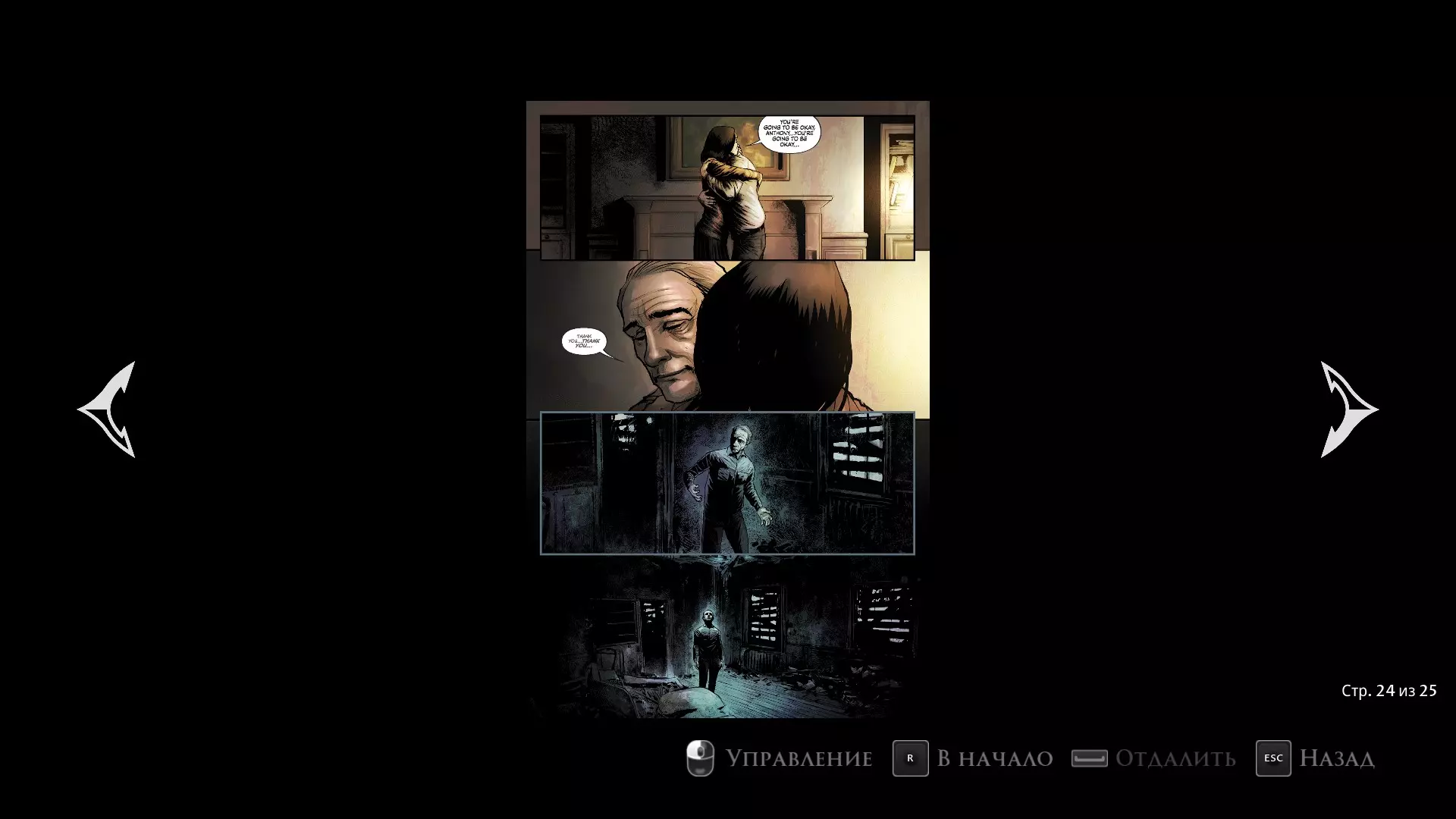 这就是这个故事可能的几种结局。但这还不是全部!游戏还附带了两部漫画,我现在就来介绍一下。其中一部正好延续了安东尼留在自己家中但没有自杀的情节。开发者或许正是通过这部漫画暗示了真正的结局……谁知道呢。 在这部漫画中,安东尼遭遇了一系列新的幻觉。他的记忆已经恢复,并且完全清楚自己到底是谁。但在他的意识里,他正身处克拉克家的完整房子中,他的私人心理医生会来这里找他。他们和心理医生一起探讨安东尼悲惨的过去,期间会传送到小希望镇的各个地点,我们能看到主角因家人的遭遇而备受煎熬。在这个小故事的结尾,他开始意识到自己需要停止因亲近之人曾遭遇的事情而自责。就在这一刻,幻觉消失了,安东尼似乎终于从沉重的负担中解脱出来。