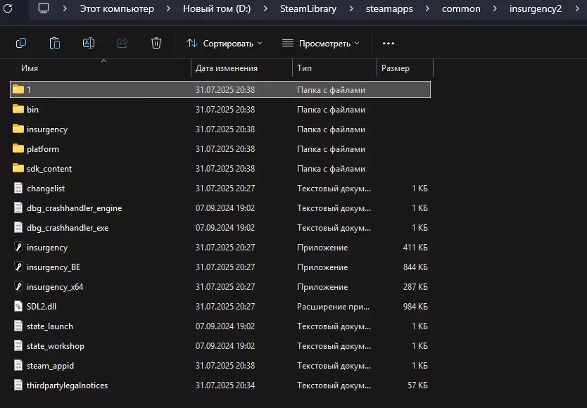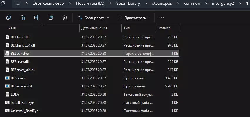 当我们找到名为BattlEye的文件夹后,将其复制并保存到桌面上。 修改《叛乱》的游戏文件。 打开《叛乱》的安装文件夹。 在列表中找到BattlEye文件夹(它在列表的第一个位置),将该文件夹重命名为任意名称,我将其重命名为“1”。 之后就会是这样的情况: