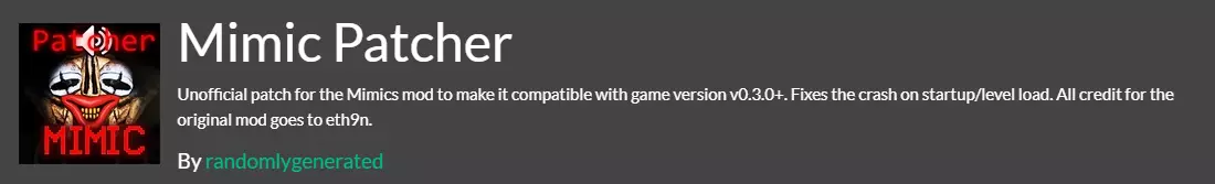 作者:randomlygenerated 描述:Mimics模组的非官方补丁,确保其与游戏v0.3.0+版本兼容。修复了关卡启动/加载时的崩溃问题。原模组的所有权利归eth9n所有。Mimic_Patcher。评价指南:如果你觉得这份指南不错,可以让更多人看到这个合集。 奖励:如果你有多余的Steam点数,可以给予奖励,我会很开心。 评论:如果某个模组无法正常运行,或者你发现了列表中没有的好东西,欢迎留言。