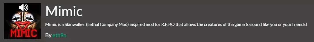 作者:eth9n 描述:受Skinwalker(致命公司模组)启发,该模组允许游戏中的生物发出与你或你的朋友相似的声音!需与Mimic_Patcher一同安装。 2. Mimic_Patcher