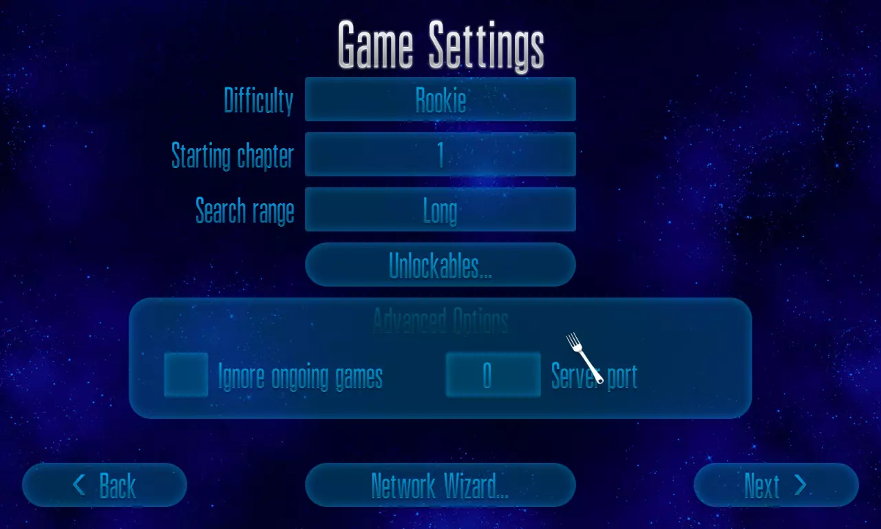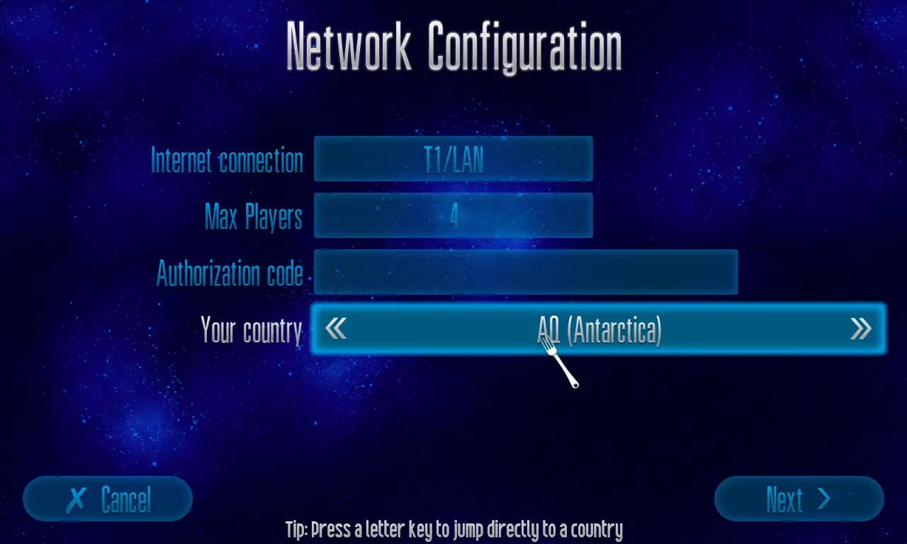 网络连接 - 可在四种连接类型中进行设置(拨号56k、ISDN、有线/ADSL、T1/LAN)。 最大玩家数 - 可设置网络允许的最大玩家数量。拨号56k固定为2人,ISDN可设为2人或3人,其余连接类型最高支持4人。 授权码 - 在线多人游戏所需,随游戏购买提供。 国家/地区 - 设置你在世界地图上的位置,以便匹配地理位置更近的玩家,获得更优质的连接。 互联网多人游戏 - 此设置允许你与互联网上所有游玩该游戏的玩家进行游戏。