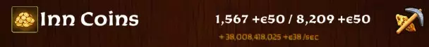 在这两张图片中,你会看到收入为3,800 +e43,工资支出为6,254 +e43。此示例显示处于亏损状态,工资支出比酒馆的产出多2,454 +e43金币。超额支出的金币正从2,107 +e54的银行存款中扣除。