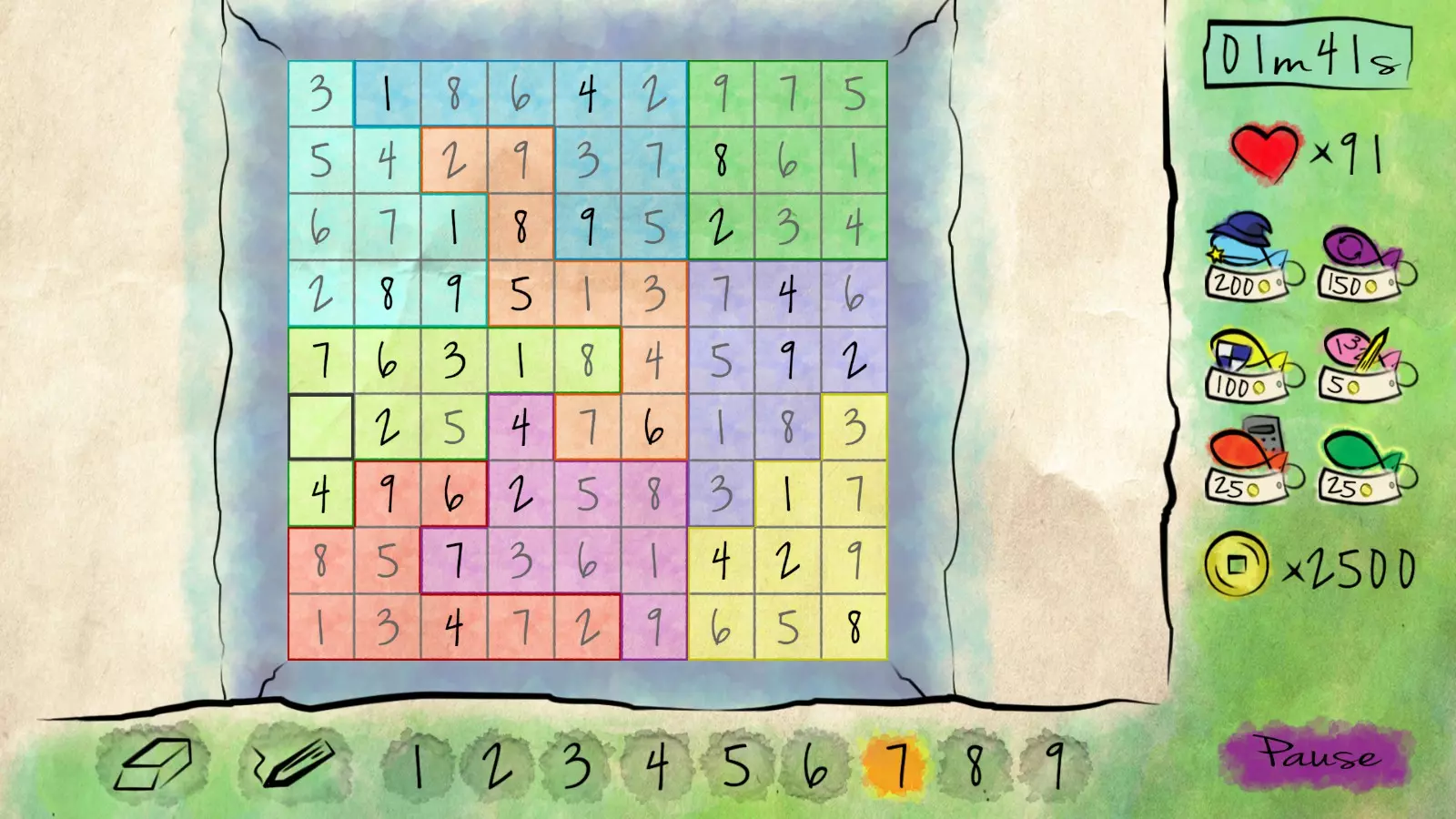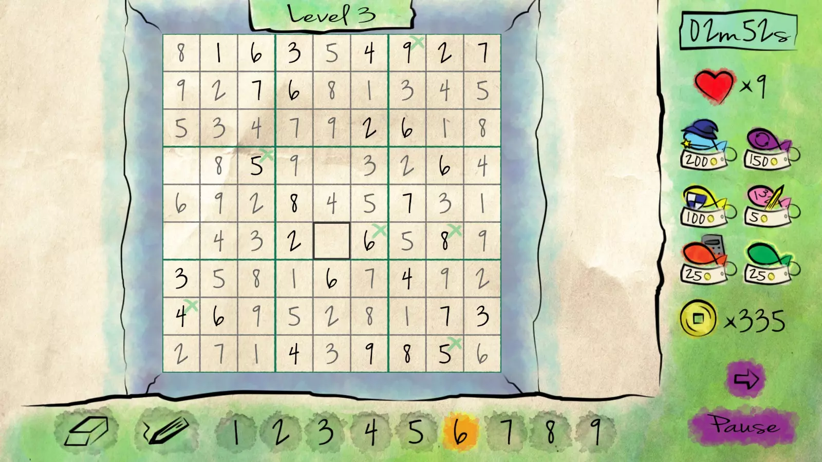 轻松写意 完成任意冒险关卡且无任何错误。 对于熟悉数独的人来说,无错通关相当简单。在尝试向单元格填入错误数字时会损失生命值。