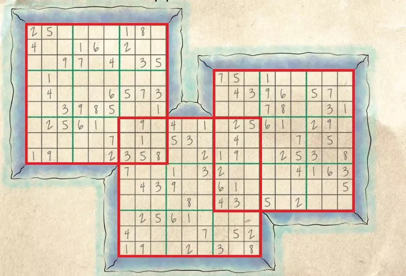 重叠经典数独 这是一种经典数独,其游戏区域存在重叠部分。若单独观察每个区域,则均遵循经典数独的所有规则:数字在每行、每列以及9宫格内均不重复。 图片中用红色方框标出的区域,均适用经典数独规则。