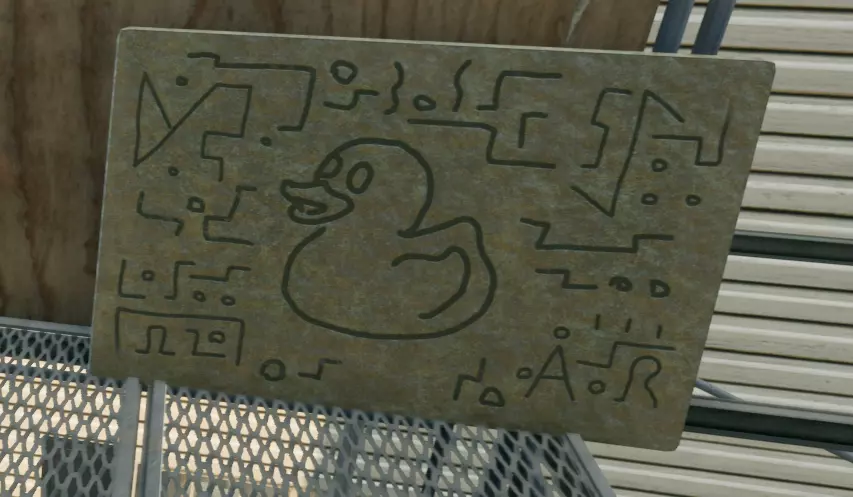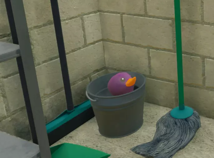 在棚屋顶部的木板桥脚手架第二层找到。 鸭子第4部分 我本来只想展示隐藏物品的位置,但在最后一层有点迷路了,所以就把这段也加了进来,不过可能只是我不太会看简单的方向指引。 1.a 背对着卡车,径直向左走,进入唯一开着的门。里面有六台服务器,顶部的鸭子数量各不相同。按照服务器顶部鸭子数量的顺序与每台服务器互动。 1.b(服务器室) 在同一房间内,门的右侧有四台电脑,与每台电脑互动。 1.c(操作室) 走出服务器室继续向左,跳过第一个房间,进入下一个房间。门的左侧有五台电脑,与每台电脑互动。 1.d(卧室) 离开手术室,进入正前方的门,与电脑互动。对同一面墙上的另外两个房间执行相同操作。墙的对面还有两个房间,同样进行互动。 1.e(实验室) 在手术室所在的走廊里,有一扇之前被激光挡住的敞开的门,门的右侧有四台电脑,与它们互动。 2.a离开实验室,从手术室取回你的高压清洗机。 2.b海绵也同样取回。 3.a在卡车所在的房间里,门的左侧有食品包,将一定数量的食品放入每个卧室。 4.a实验室里有一把彩色枪,用这把枪吸走漂浮的绿色液体。 5.a手术室中央的床上有一把激光枪。每个房间里都有你要清理的垃圾(包括卡车旁边的汽车)。 使用海绵擦去三个不明飞行物上的所有紫色痕迹。其中两个在通往卧室的走廊里,一个在有卡车的房间里。