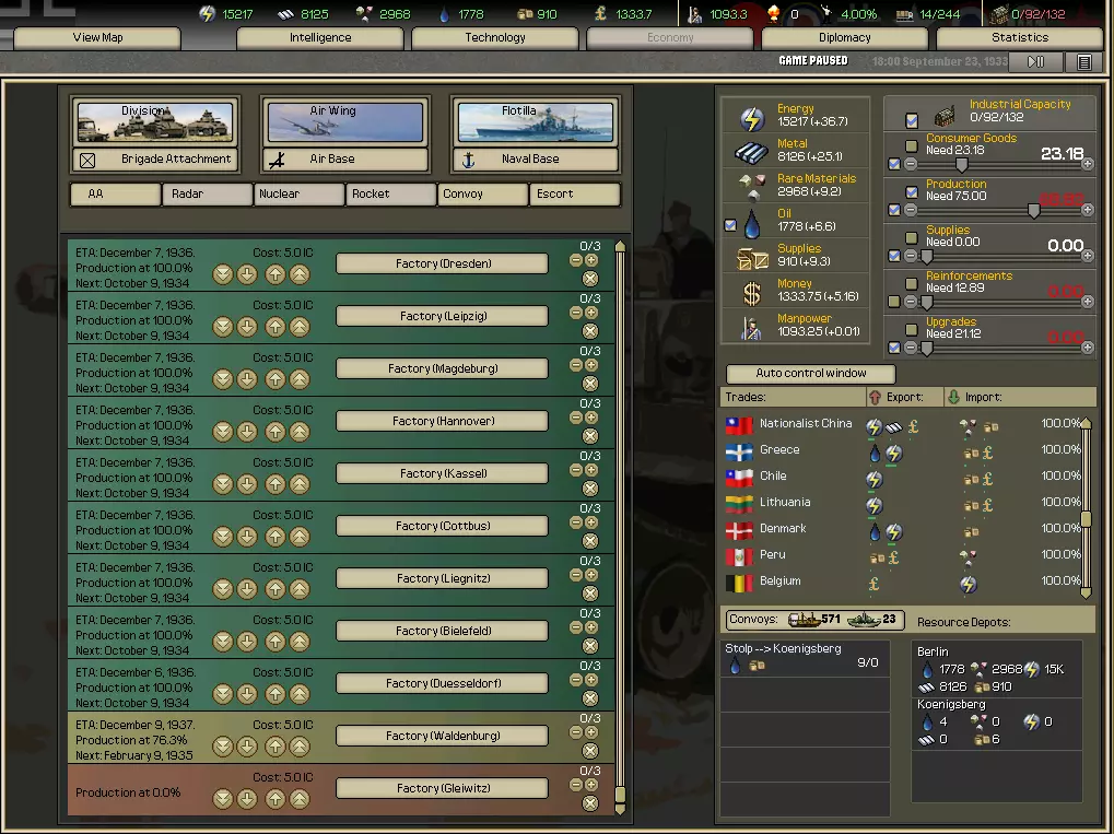 生产 进入生产界面,取消所有在建船只——它们会消耗宝贵的IC(工业产能),且对 Kriegsmarine(德国海军)几乎没有益处。接下来,在同一界面中,将资源自动管理设置为囤积资金和石油。将用于增援和升级的IC降至0,并右键点击进度条上的滑块将其锁定。你需要尽快将尽可能多的IC分配给消费品。这能减少不满度并产生资金,这是你目前真正需要的。将护航舰队设置为完全自动,然后进入科技环节。 科技 科技研发稍后再进行。目前,科技研究成本过高,而你需要资金来触发事件。我从未在1934年前进行科技研发时遇到过任何问题,你也应该如此。当你开始进行研发时,要注意每个技术团队的具体子技能,以便挑选出最佳团队。总体技能固然重要,但如果某个团队只掌握该科技的一项相关技能,其研发速度会慢于总体技能稍差但掌握更多相关技能的团队。例如:假设有一项海军科技,要求3点海军技能和1点组织度技能,你可能会选择隆德施泰特,因为他是9级。但问题在于,他只具备1/5的相关技能,因此在研发除该技能外的其他部分时会受到惩罚。而如果你选择一个拥有3/5相关技能的海军团队,研发速度会快得多。需要注意的是,超前研发惩罚非常显著。这正是决策的关键所在…… 情报 减少情报资金投入。我通常会将其降低两个等级,这样每天可额外获得0.5资金,积少成多效果显著。在触发最后一个需要资金的事件【MEFO票据】后,你可以放心提高这一数值。目前,所有精力都应集中在为决策积累资金上。不要将其设置为自动任务,否则你的资金会被用于间谍活动,而无法在国库中积累!