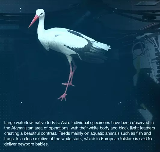 仅在夜间出现在所示区域 稀有度:普通 地点:阿富汗 获取方法:麻醉后使用富尔顿回收系统