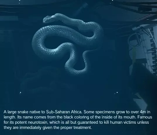 它不像近亲黑曼巴那样有毒,在地图的山区地带分布较散,你得碰碰运气,祝好运。 稀有度:不常见 位置:阿富汗 捕获方法:陷阱 黑曼巴