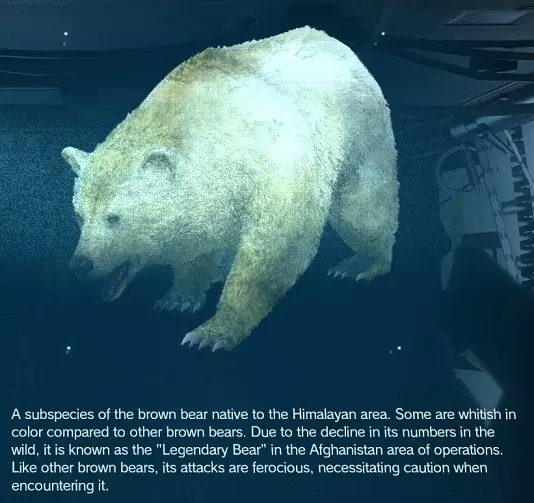 其中两只可以在支线任务147的废墟附近找到。其他的可以在以下地点找到。 请谨慎接近……这些棕熊不好惹。 稀有度:稀有 地点:阿富汗 获取方法:麻醉后 Fulton(富尔顿)回收