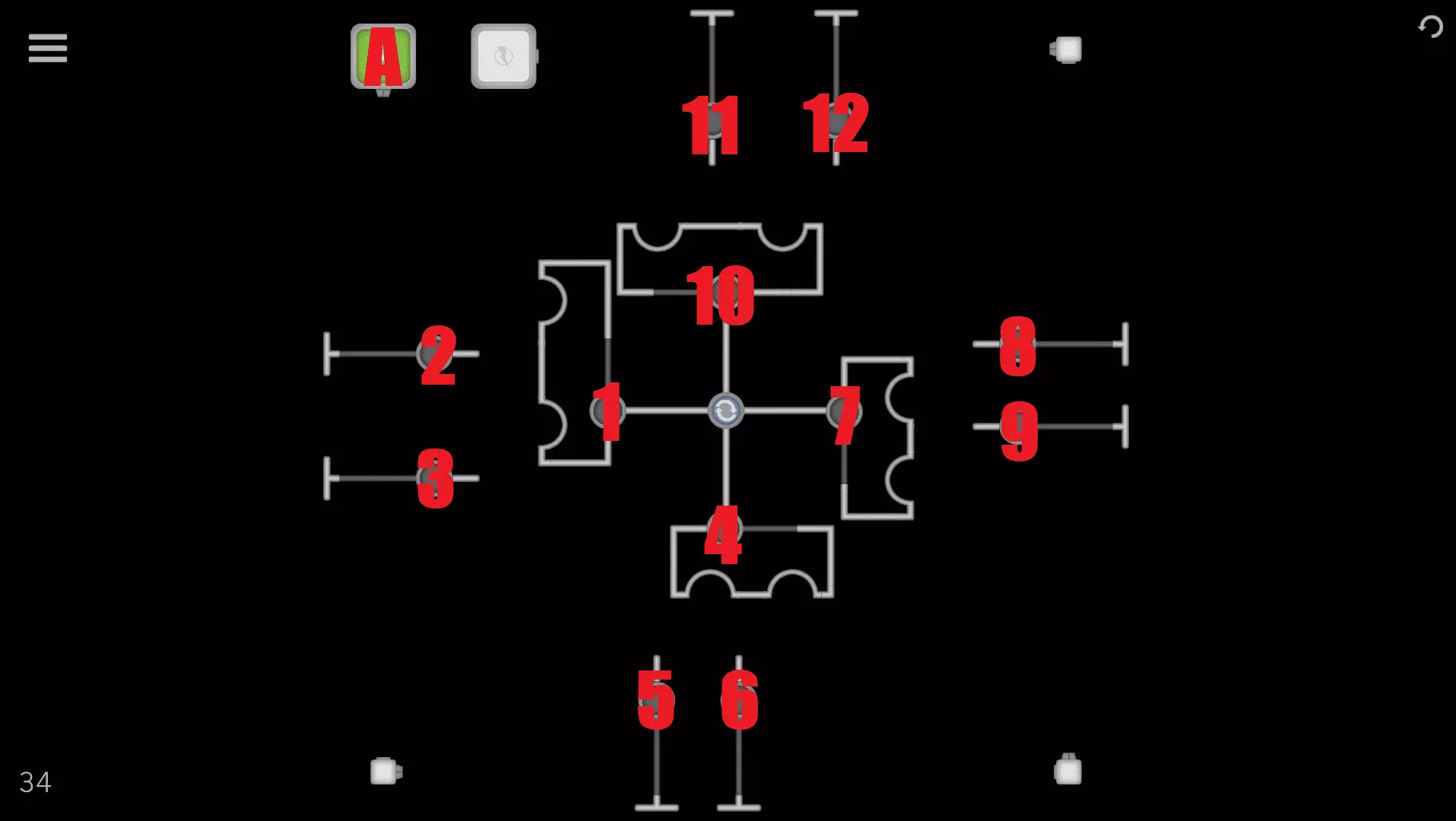 1→2→3→4→5→6→ A→B→6→5→7→C 34级:点击中央按钮三次以旋转建筑。