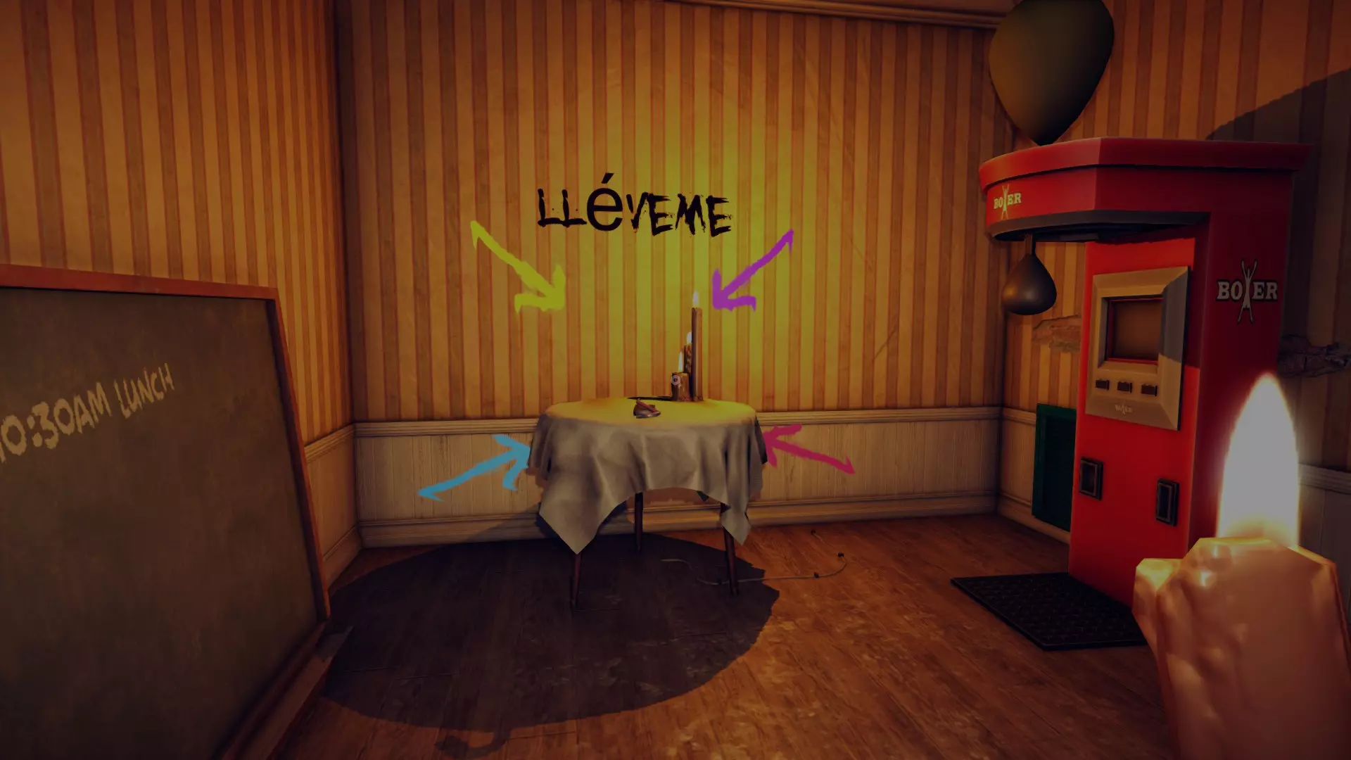 当你遇到西奥多(那个小丑)时,拿起把手并打开水来吓退怪物,然后前往怪物所在的房间,一直走到尽头并启动左边的拉杆。向右走,进入那个会打开衣柜并投射出小丑服装的房间,注意房间门后有一个立方体,拿起它并把它放在警察的脚下,这样他就不会再让地面沾满血迹,怪物也就无法回来了。之后回到走廊,关闭水把手,拿着点燃的蜡烛回到警察的房间,继续走向黑暗区域,你会找到安迪的避难所,在他的床旁边有一把钥匙,拿起钥匙,然后继续走向幻象。删除小丑