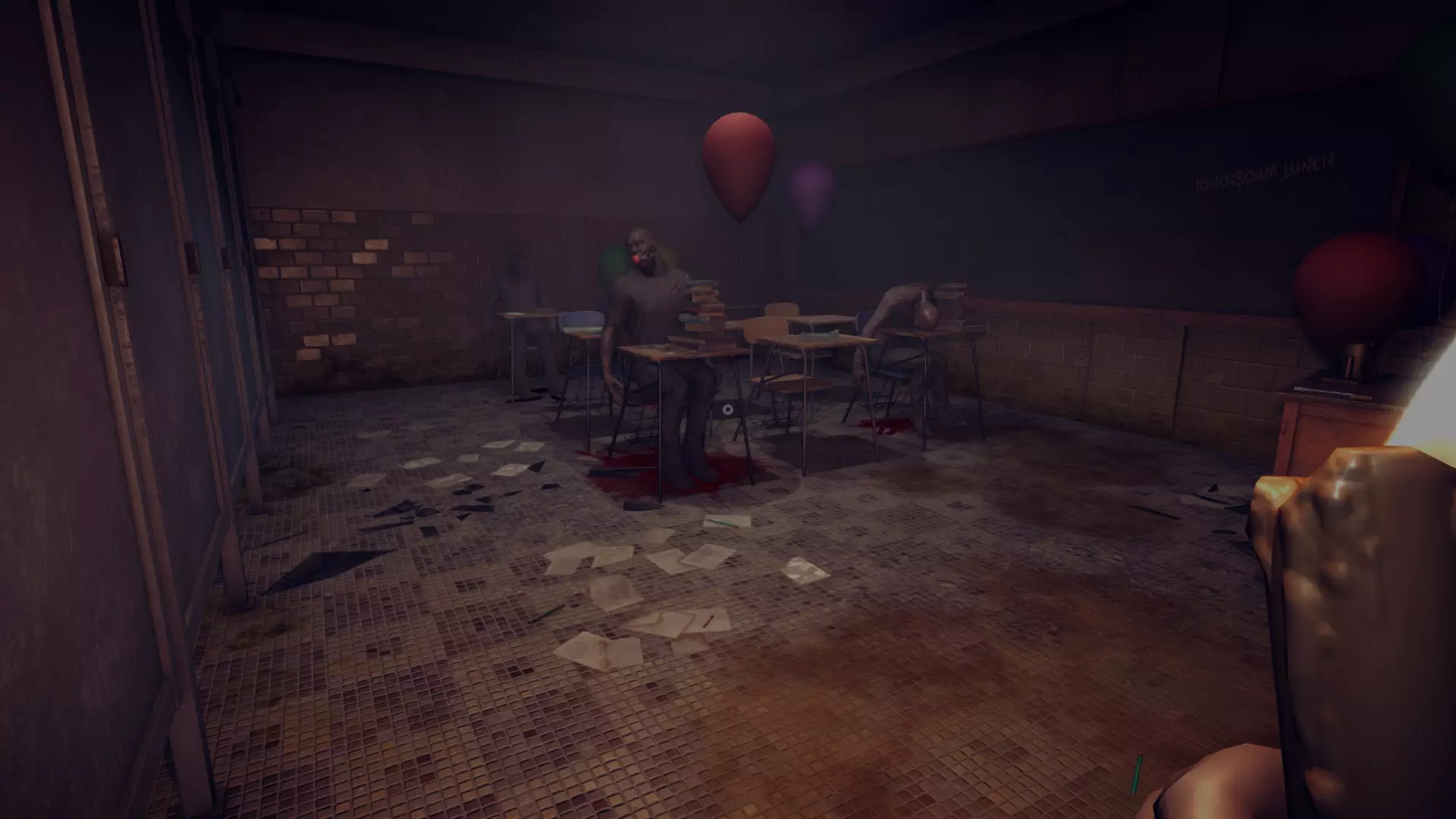 当你到达学校时,拿起西奥多留给你的拉杆,试着前往那个藏着小丑的房间,这个房间和一些浴室相连。拉动那个房间里的拉杆,然后拿起桌子上的钥匙。试着跑向对面那个有笼子的房间,穿过布满蜘蛛网的洞口,这个藏身之处会带你到一个时钟那里。把你之前穿过红门时找到的指针安到时钟上,然后将时间设置为午餐时间10:30,这会打开一个放着面具的柜子。拿起面具后返回,西奥多已经离开了,走楼梯那里的出口路径。