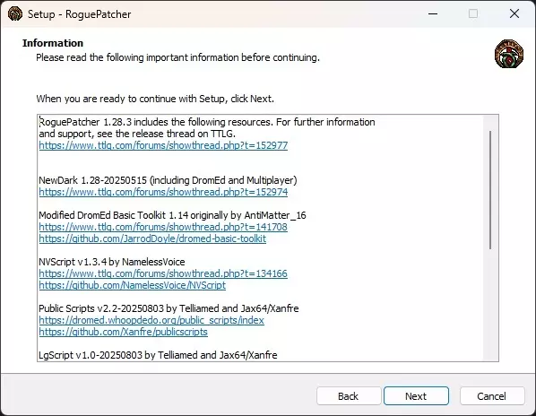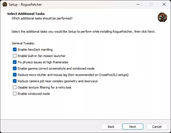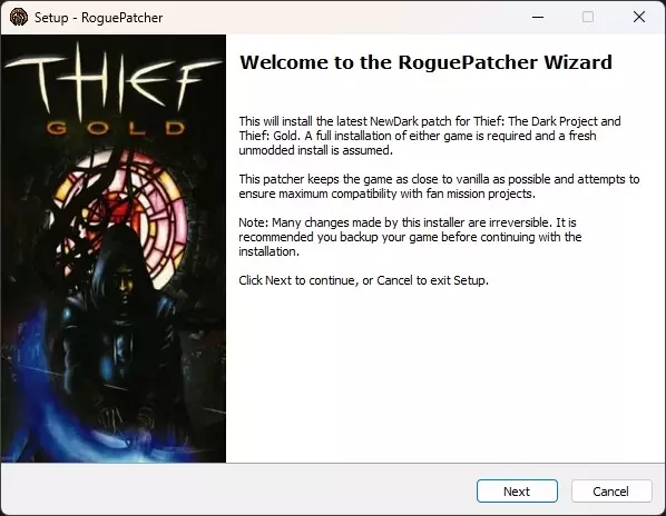 -进入并退出游戏一次。 非官方补丁(选项2):RoguePatcher 《神偷:暗黑计划/黄金版》的非官方补丁。作为替代方案开发的非官方补丁,因为TFix修改了游戏的部分原始素材。 RoguePatcher:非官方补丁v1.28.4 制作者:HavvicGames RoguePatcher 现代系统兼容性 ✔ 技术修复 ✔ DromEd任务编辑器 ✔ 部分修复 ✔ 可选增强模组 Steam 存在问题。因此,你必须安装RoguePatcher。 GOG 无问题运行。包含TFix精简版。不过,建议安装RoguePatcher以充分利用其所有功能。 非官方补丁(选项2):RoguePatcher 如果你的文件位置受目录保护,RoguePatcher可能无法安装。要解决此问题,请将游戏文件夹临时移动到C:盘并在那里安装非官方补丁。安装完成后,将游戏文件夹移回原位置。 安装说明 -运行RoguePatcher_1.28.4.exe。 -在打开的屏幕上点击下一步。