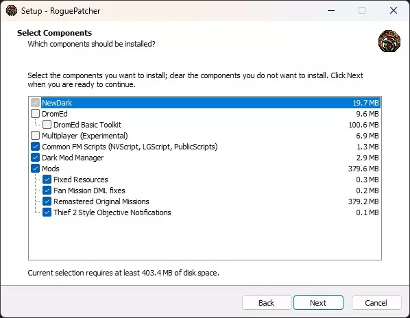 安装程序会询问你想要安装哪些组件。 NewDark(将DarkEngine引擎更新为NewDarkEngine引擎。) DromEd(用于创建粉丝任务的任务编辑器。如果你只是想玩游戏,请勿勾选此项。) 多人游戏(实验性)(如果未在第二个多人游戏上安装,将会导致游戏损坏。请勿勾选此框。) 通用粉丝任务脚本(NVScript、LGScript、PublicScripts)(用于解决粉丝任务中问题的特殊脚本。) Dark Mod Manager(用于安装模组的安装器。) 修复的资源文件(一些修复后的资源文件。) 粉丝任务FML修复(一系列粉丝任务的修复补丁。) 重制的原版任务(针对原版任务的修复。) 《神偷2》风格的任务提示(《神偷2》风格的任务提示音效。)选择组件后,点击下一步。