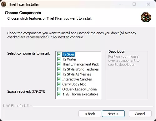 安装程序会询问你想要安装哪些组件。 T2天空(动态天空,引入《神偷2》的天空技术) T2水面(改进的水面效果,引入《神偷2》的水面技术) 神偷增强包(改进的物体模型和纹理,如果你想安装ESRGAN、增强包2或NecroAge纹理模组,建议安装此组件) T2风格世界纹理(改进的世界纹理,包含《神偷2》风格的熔岩、石墙和木地板) T2风格AI模型(Daemonite改进的AI和武器纹理,如果你想使用增强包2或NecroAge纹理模组,建议安装此组件) 互动蜡烛(互动蜡烛功能,为蜡烛添加火焰效果,你可以用水箭点击熄灭蜡烛,也可以用火箭点燃未点燃的蜡烛)携带尸体模组(R Soul的尸体携带纹理) 旧暗传承引擎(旧暗可执行文件。包含原版和DDFixed。旧引擎。请勿勾选。) 索恩可执行文件(新暗1.28可执行文件。建议勾选。) 选择组件后,点击下一步。
