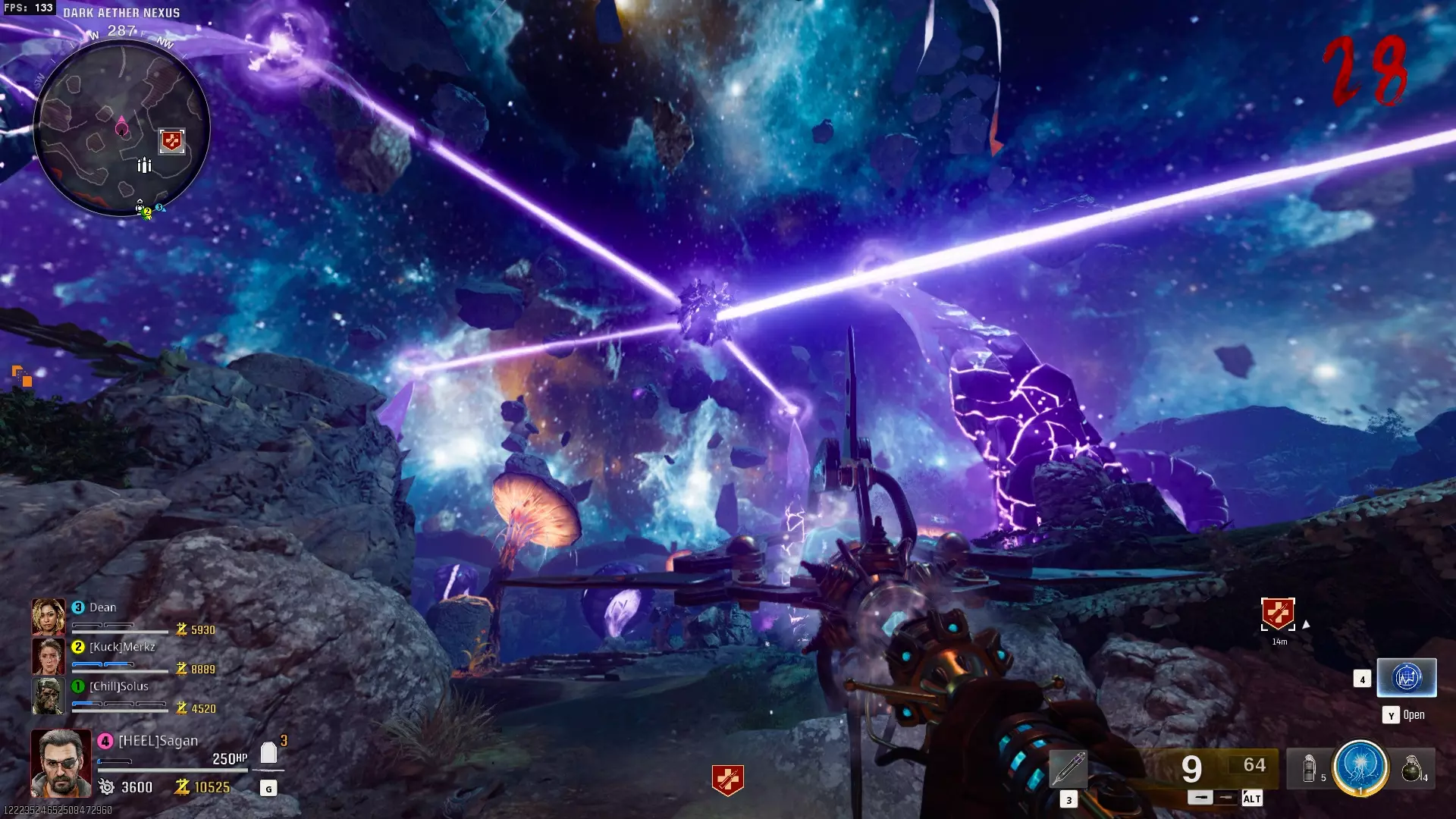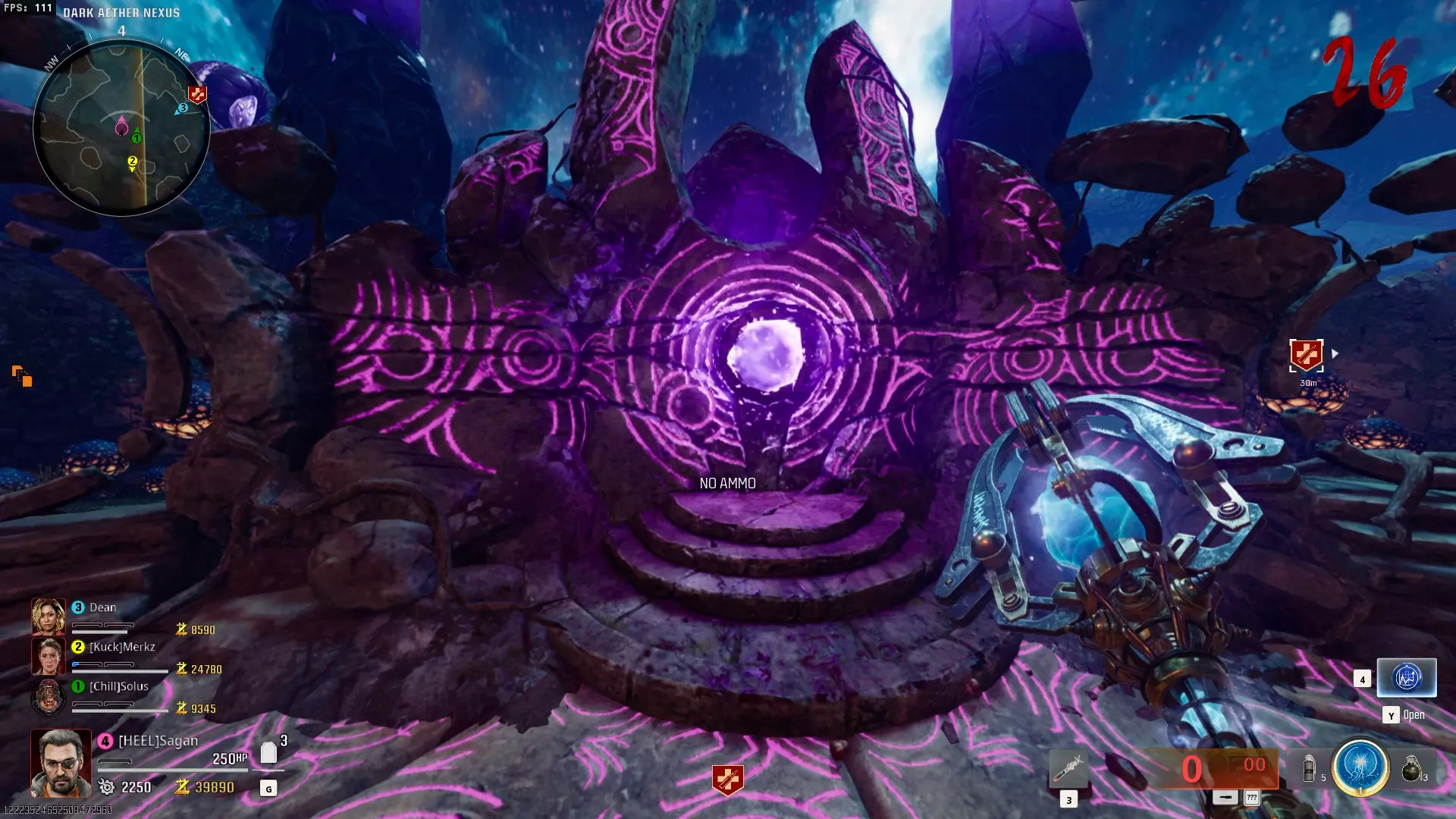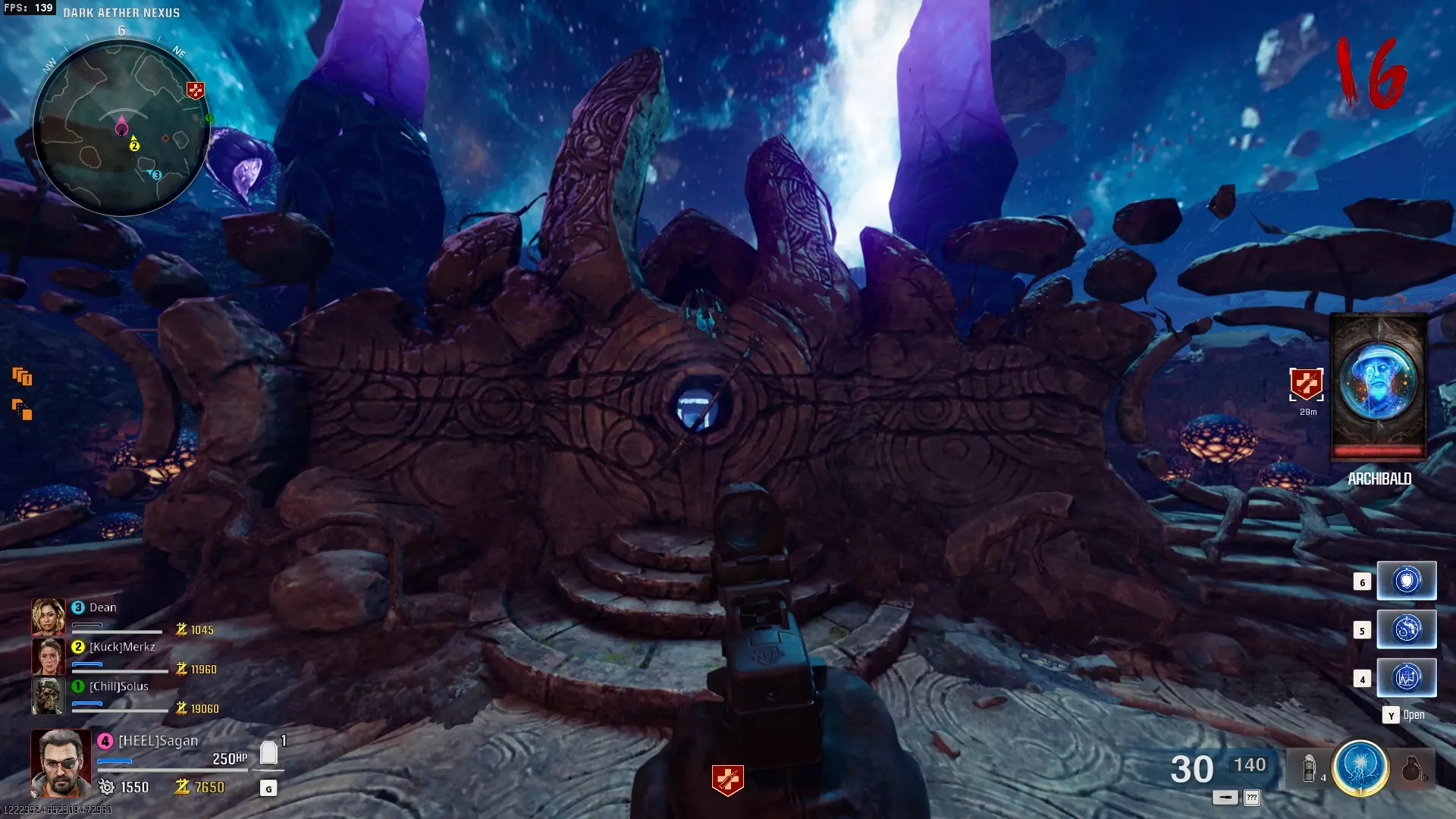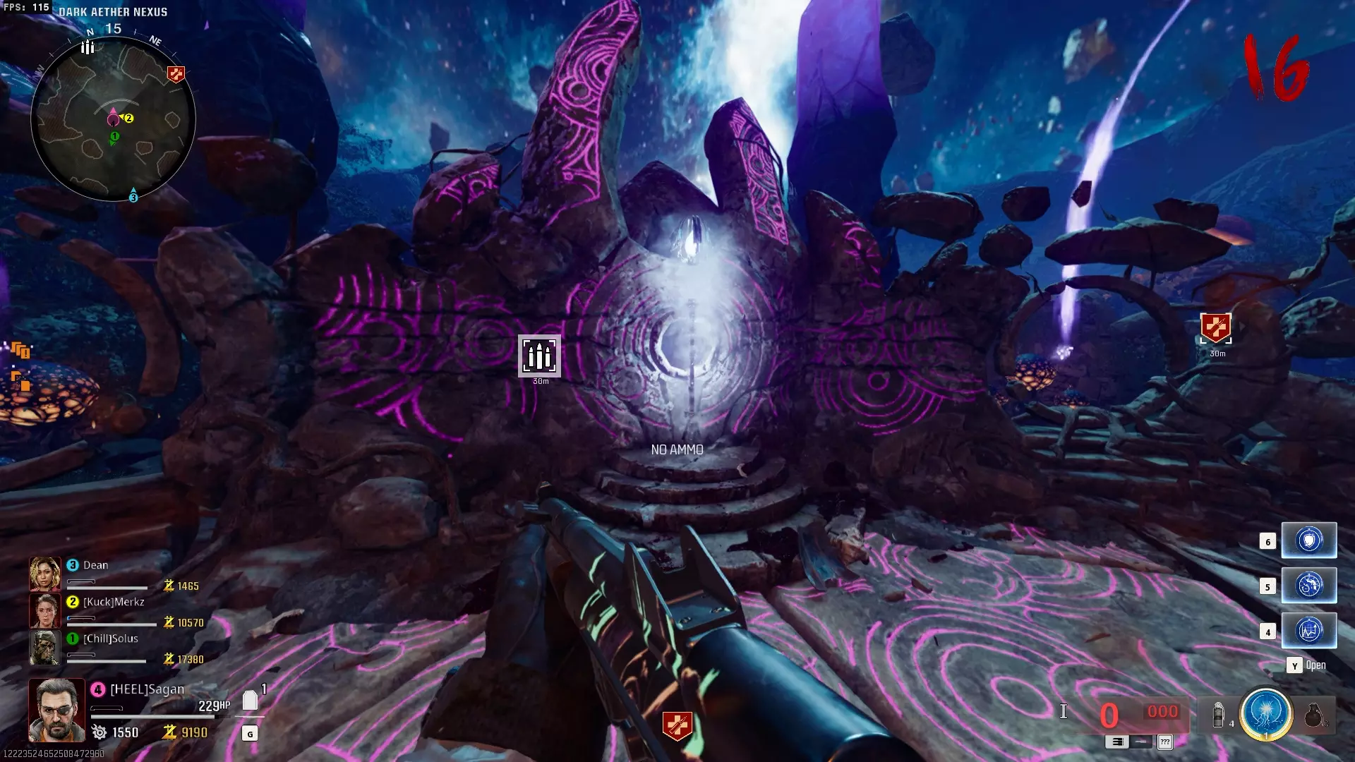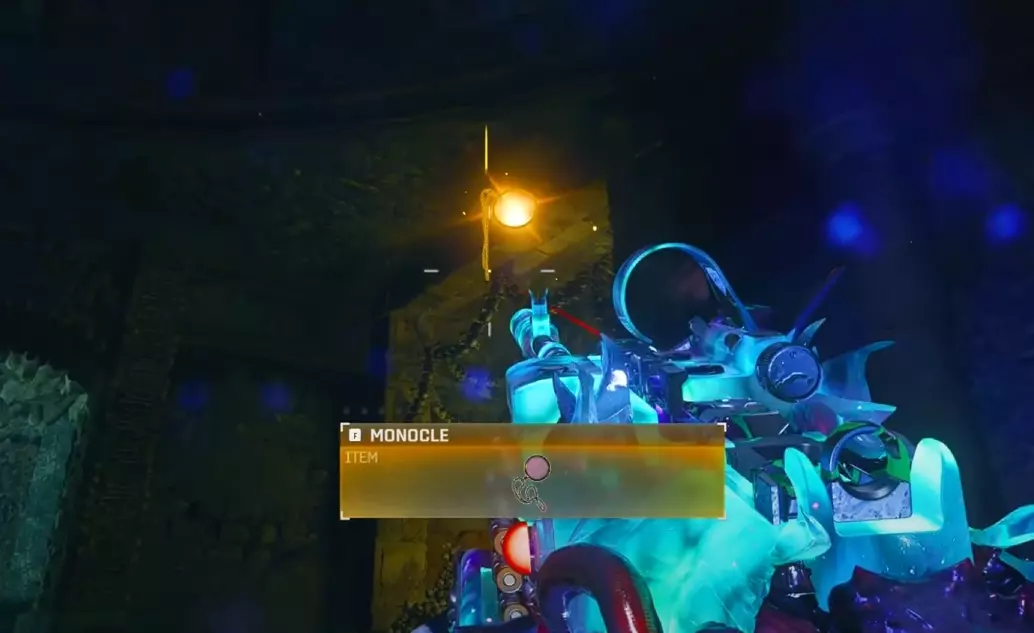 与紫色球体互动后跳下。【注意:此部分略带难度且较为繁琐。】 与球体互动后,它会漂浮下降并在移动时生成僵尸。你/玩家需要做的是紧跟球体,同时射击/消灭不断生成的僵尸,直到球体完全绕完整个“黑暗以太枢纽”竞技场,最终进入神殿中央。