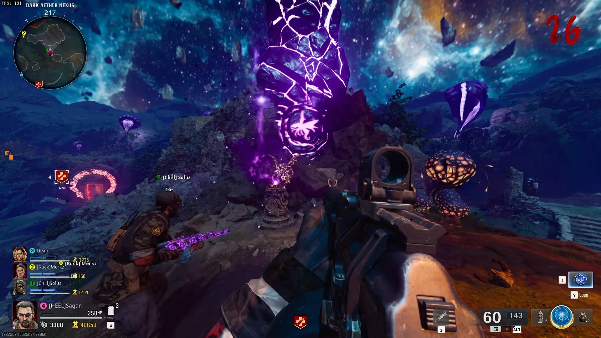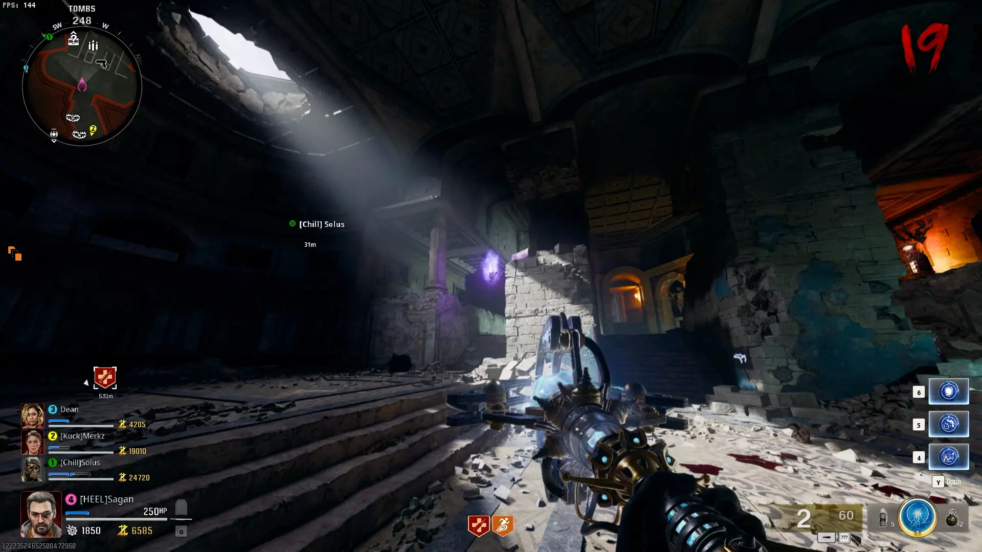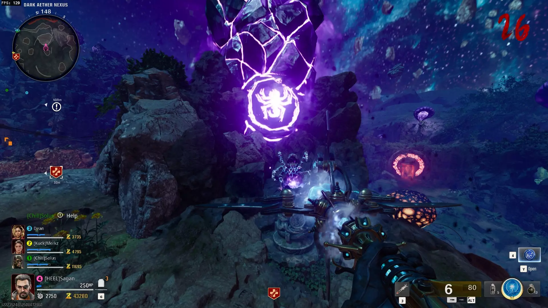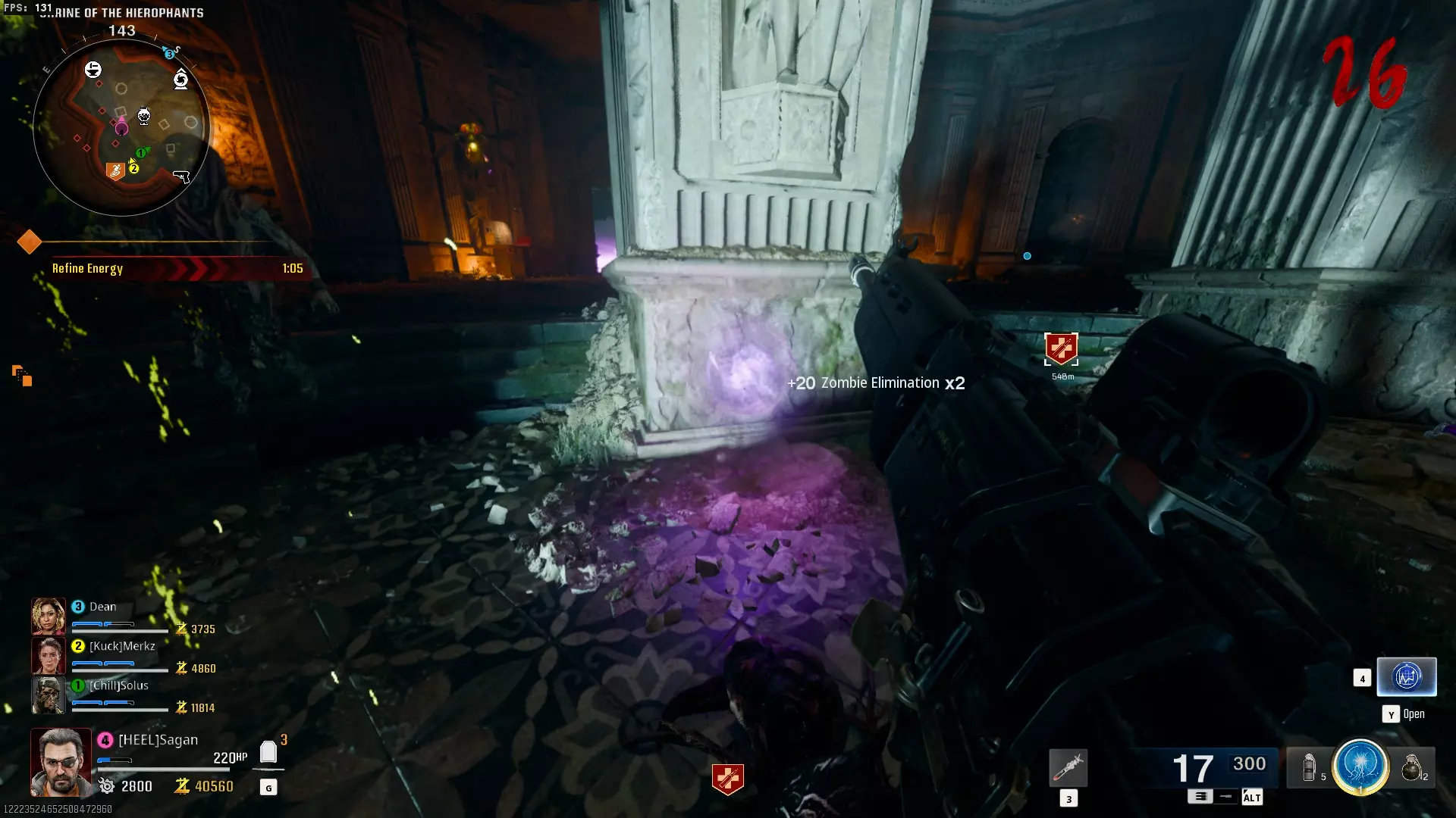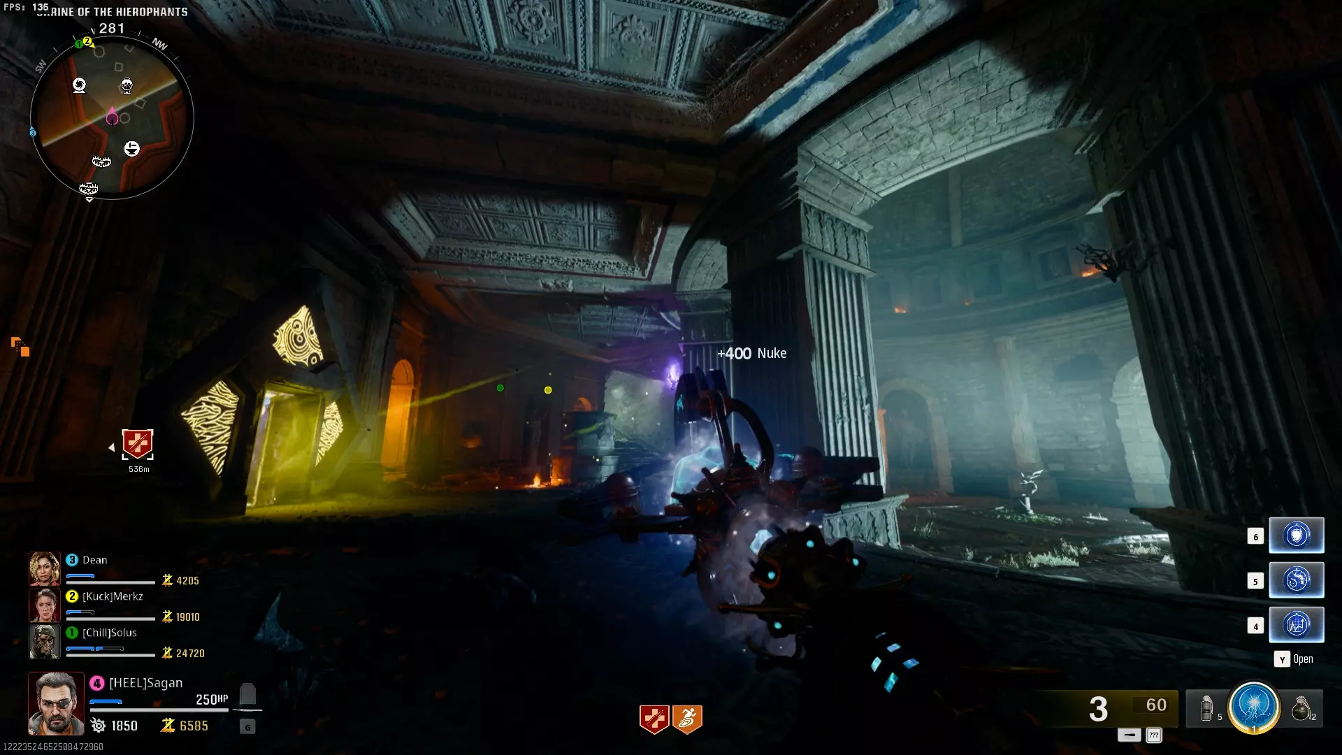 与紫色球体互动后跳下。【注意:此部分略带难度且较为繁琐。】 与球体互动后,它会漂浮下降并在移动时生成僵尸。你/玩家需要做的是紧跟球体,同时射击/消灭不断生成的僵尸,直到球体完全绕完整个“黑暗以太枢纽”竞技场,最终进入神殿中央。