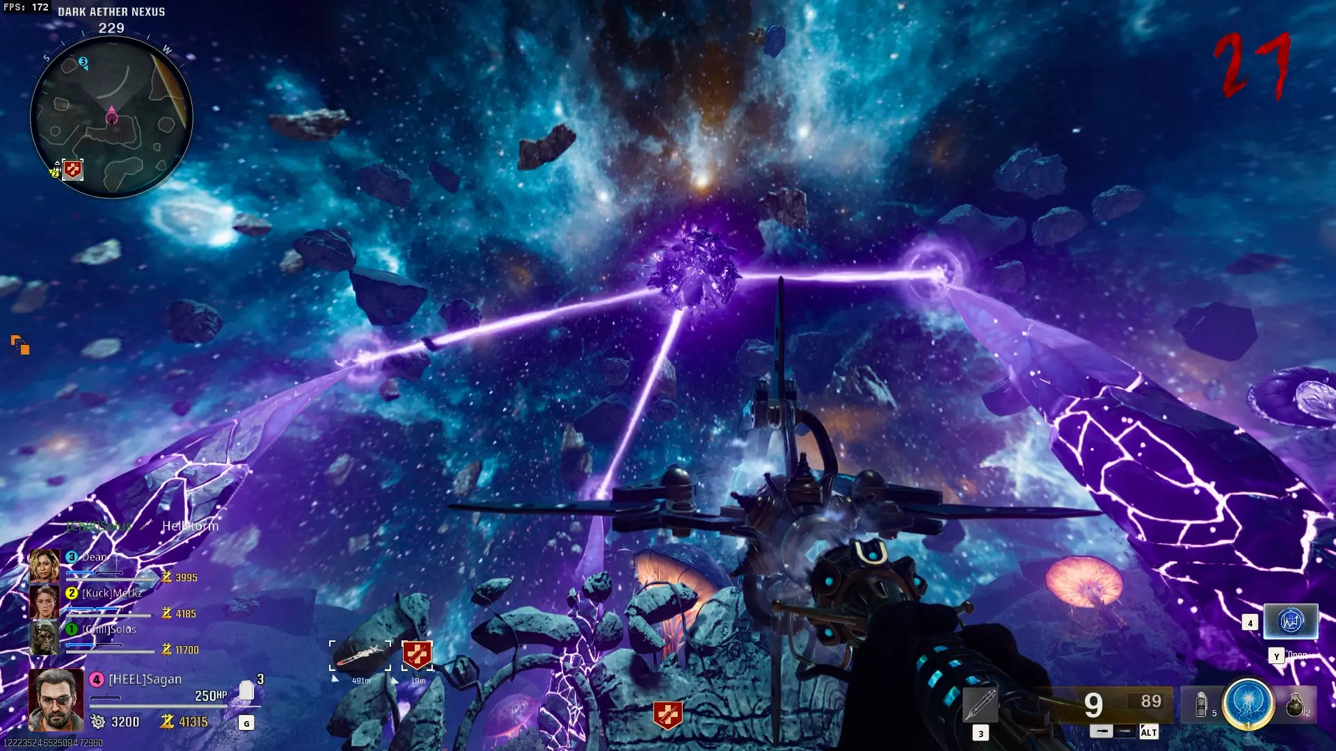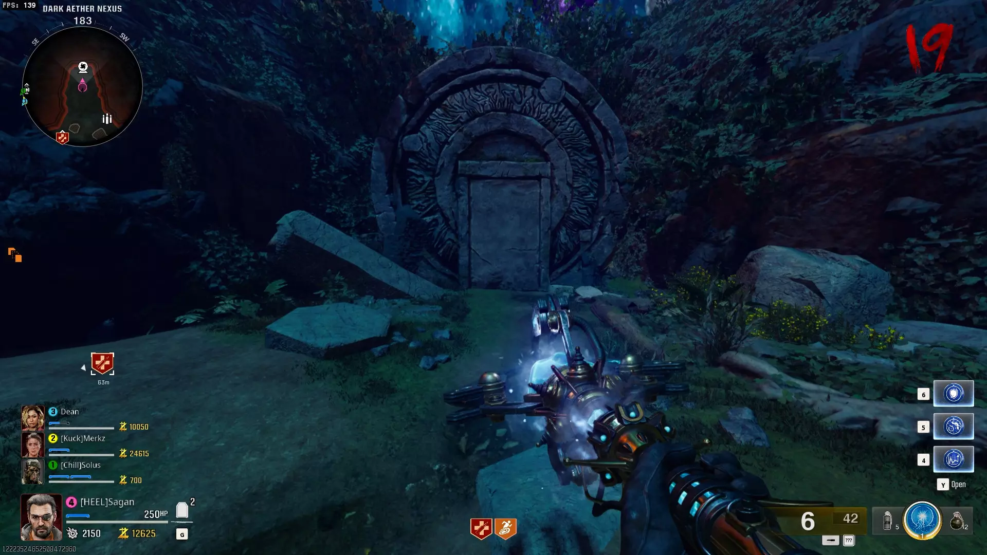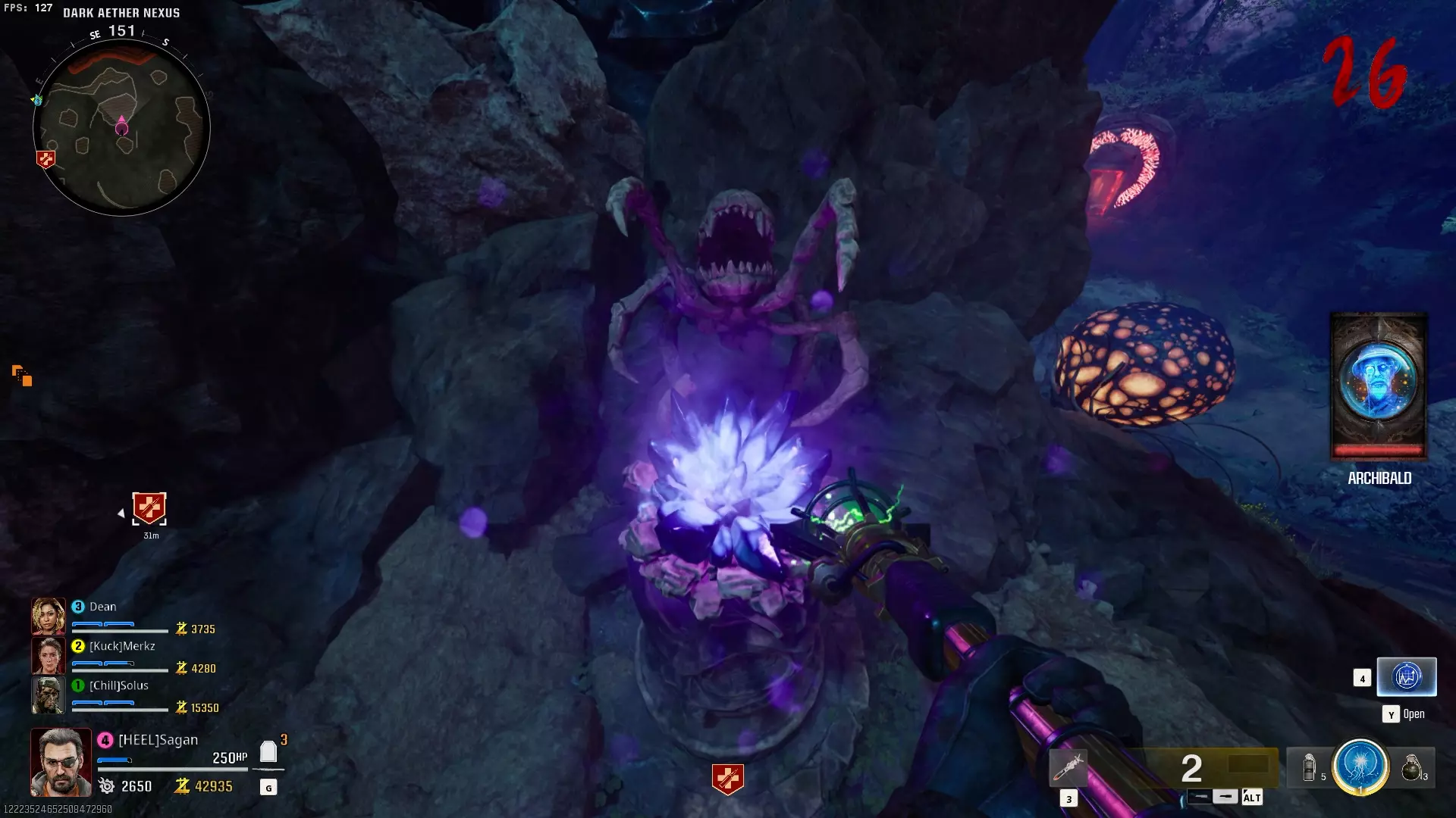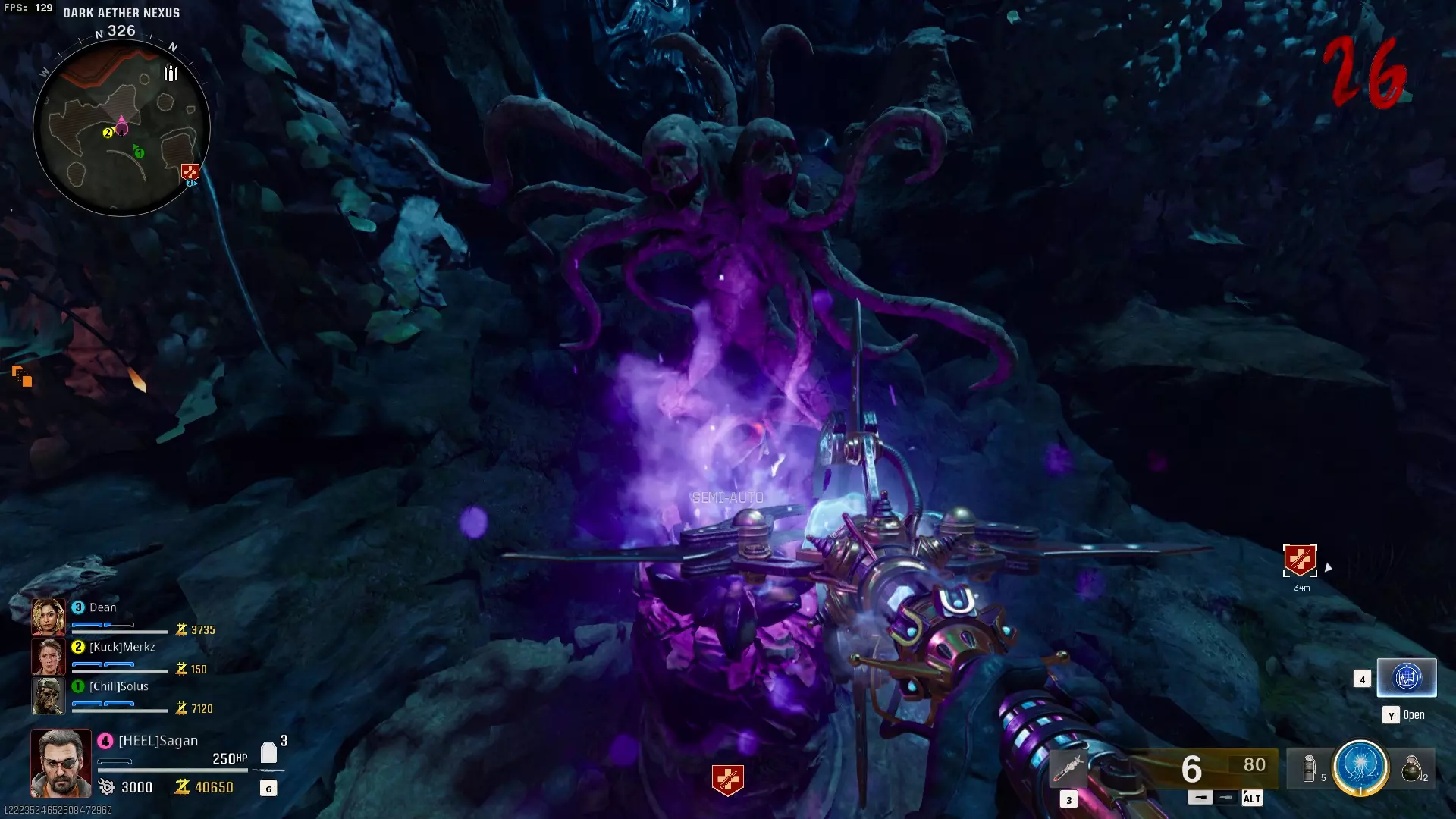 与紫色球体互动后跳下。【注意:此部分略带难度且较为繁琐。】 与球体互动后,它会漂浮下降并在移动时生成僵尸。你/玩家需要做的是紧跟球体,同时射击/消灭不断生成的僵尸,直到球体完全绕完整个“黑暗以太枢纽”竞技场,最终进入神殿中央。