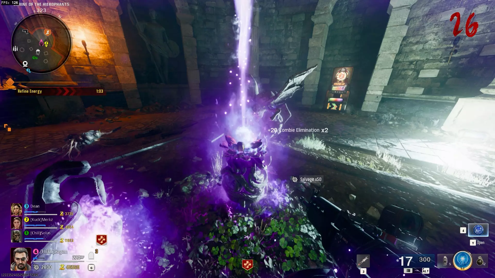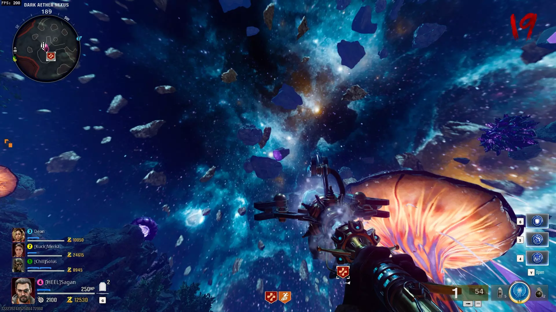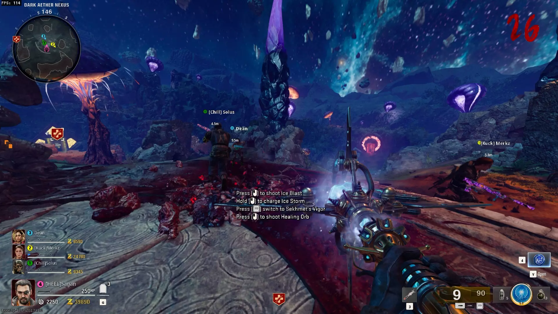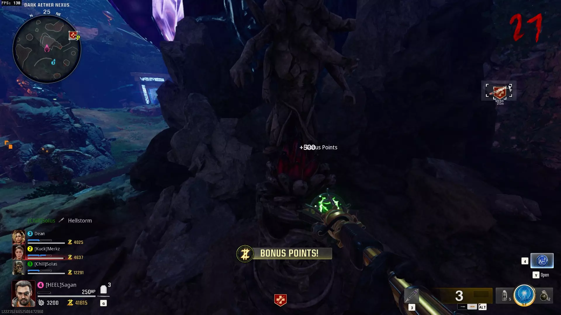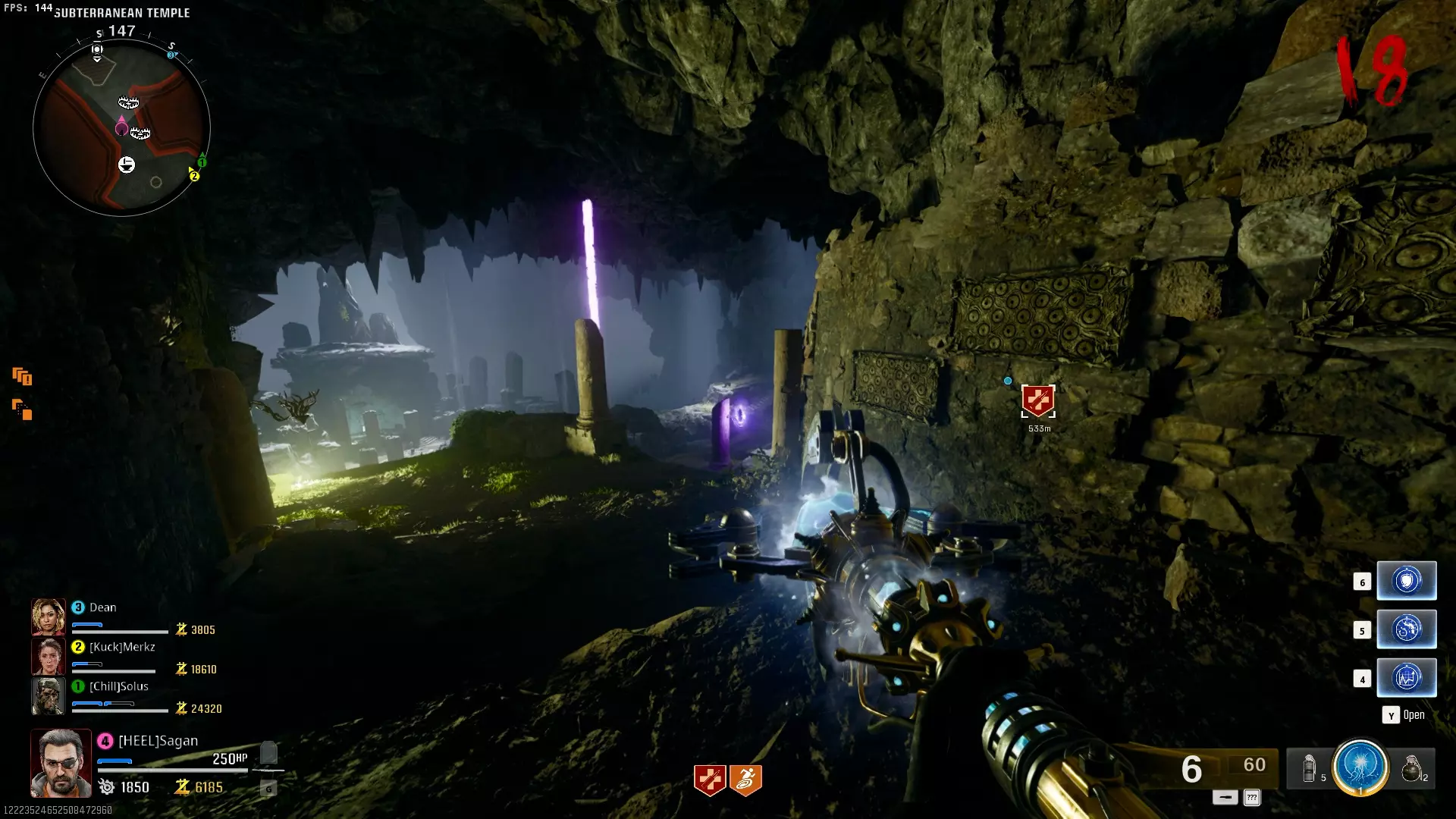 与紫色球体互动后跳下。【注意:此部分略带难度且较为繁琐。】 与球体互动后,它会漂浮下降并在移动时生成僵尸。你/玩家需要做的是紧跟球体,同时射击/消灭不断生成的僵尸,直到球体完全绕完整个“黑暗以太枢纽”竞技场,最终进入神殿中央。