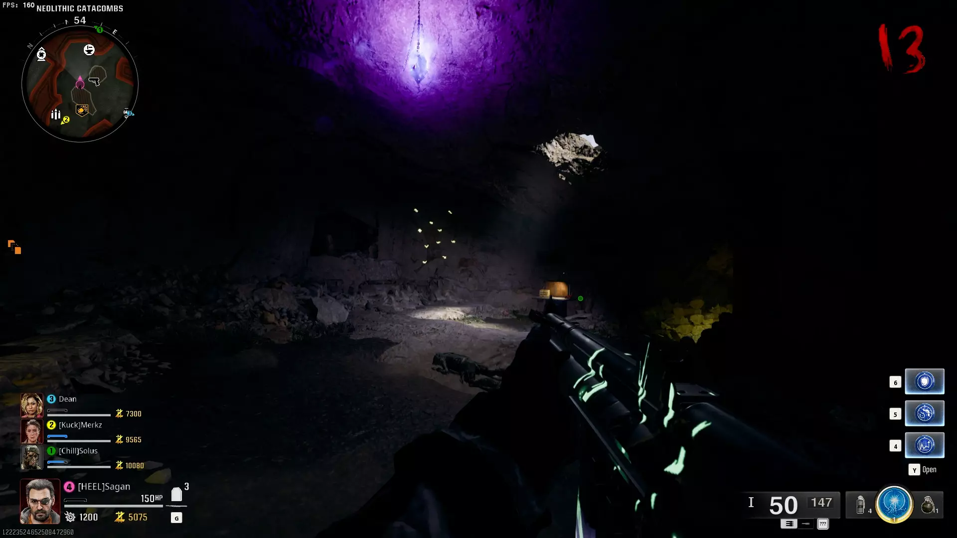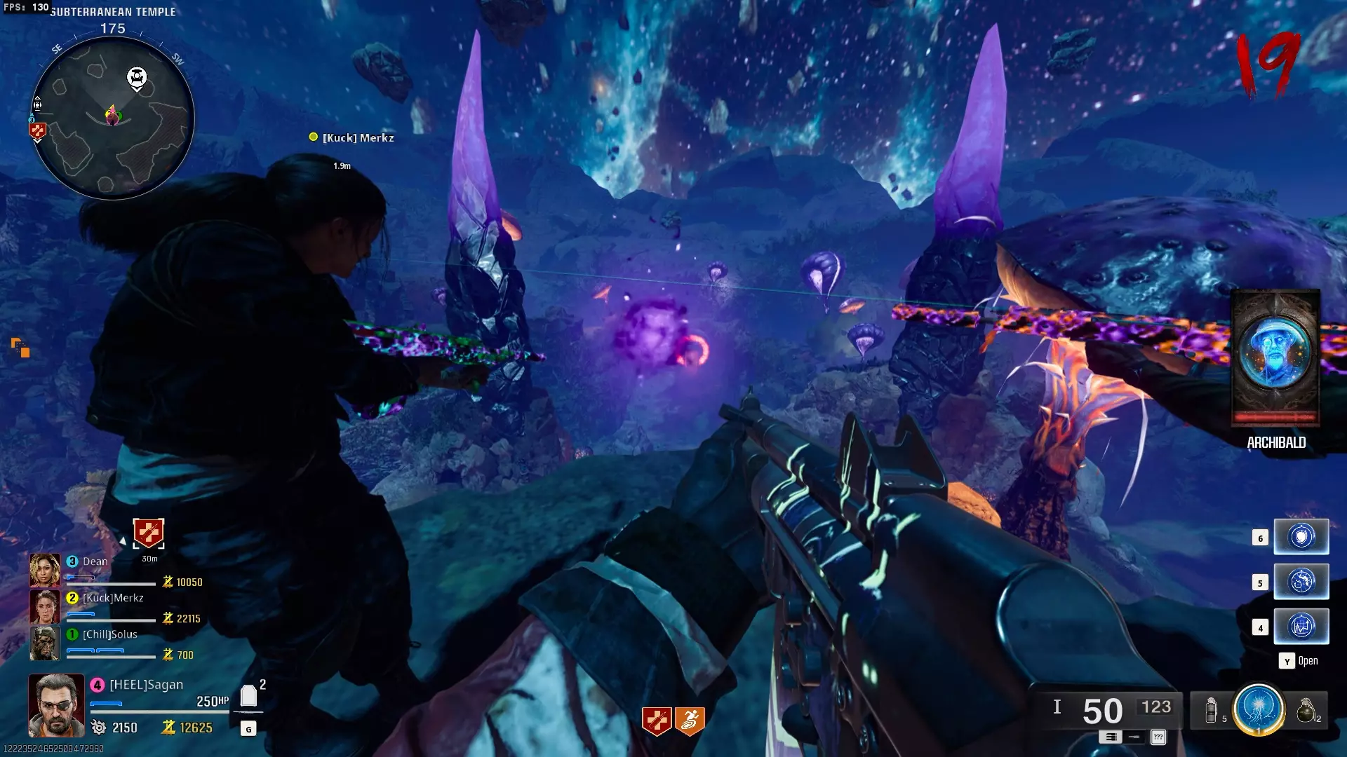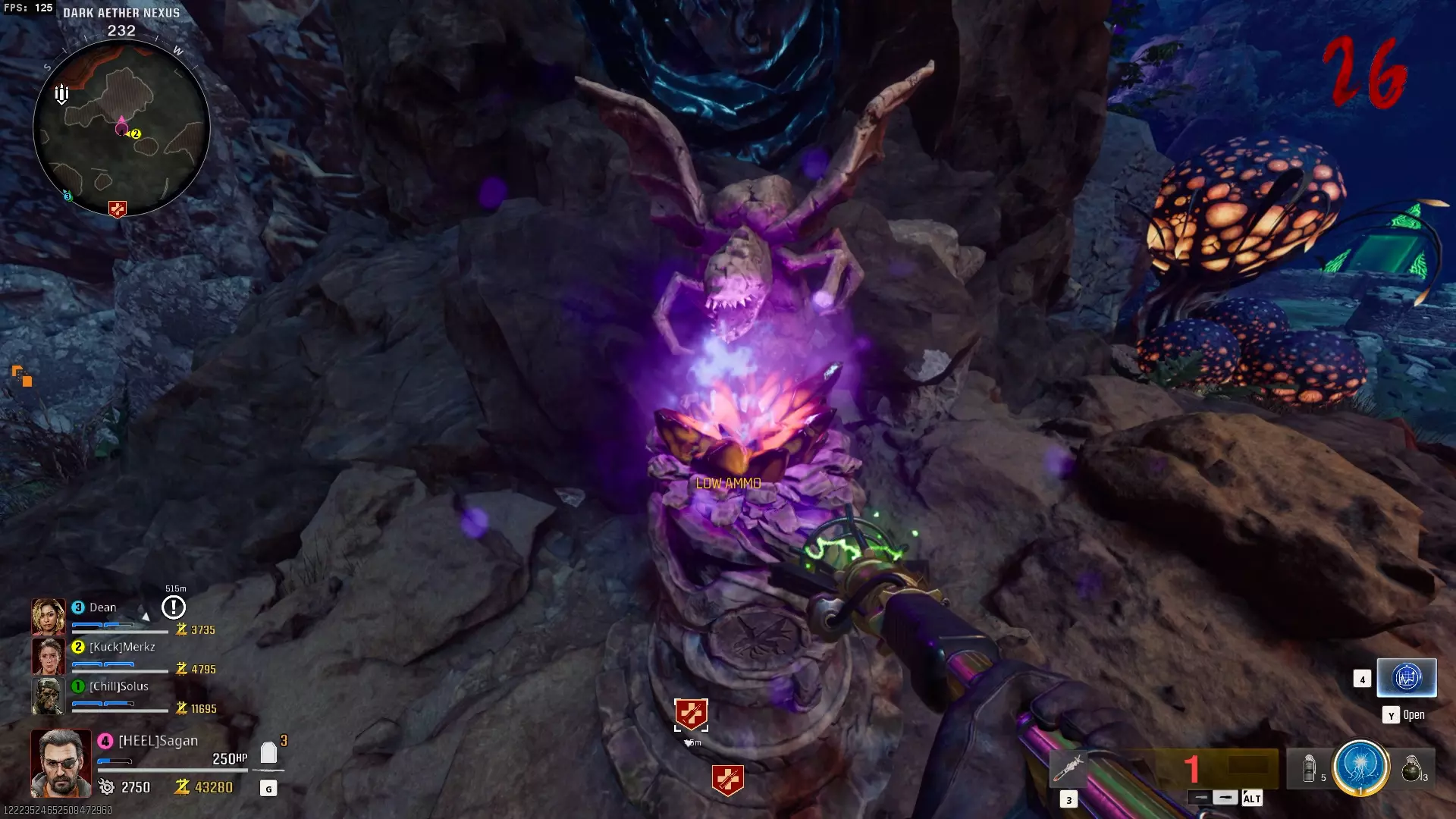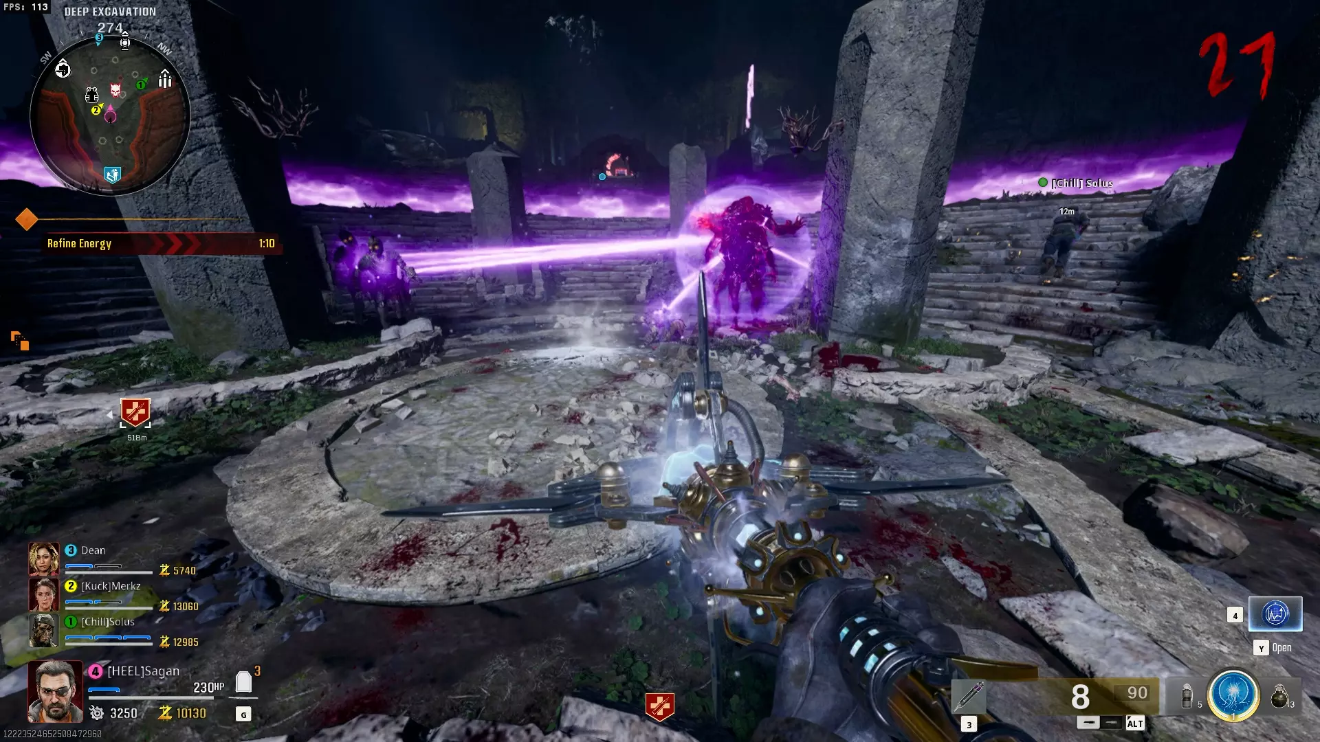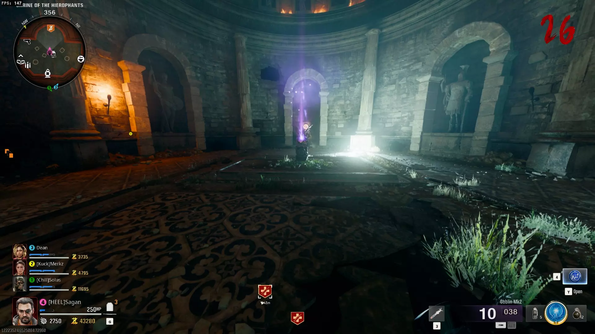 与紫色球体互动后跳下。【注意:此部分略带难度且较为繁琐。】 与球体互动后,它会漂浮下降并在移动时生成僵尸。你/玩家需要做的是紧跟球体,同时射击/消灭不断生成的僵尸,直到球体完全绕完整个“黑暗以太枢纽”竞技场,最终进入神殿中央。