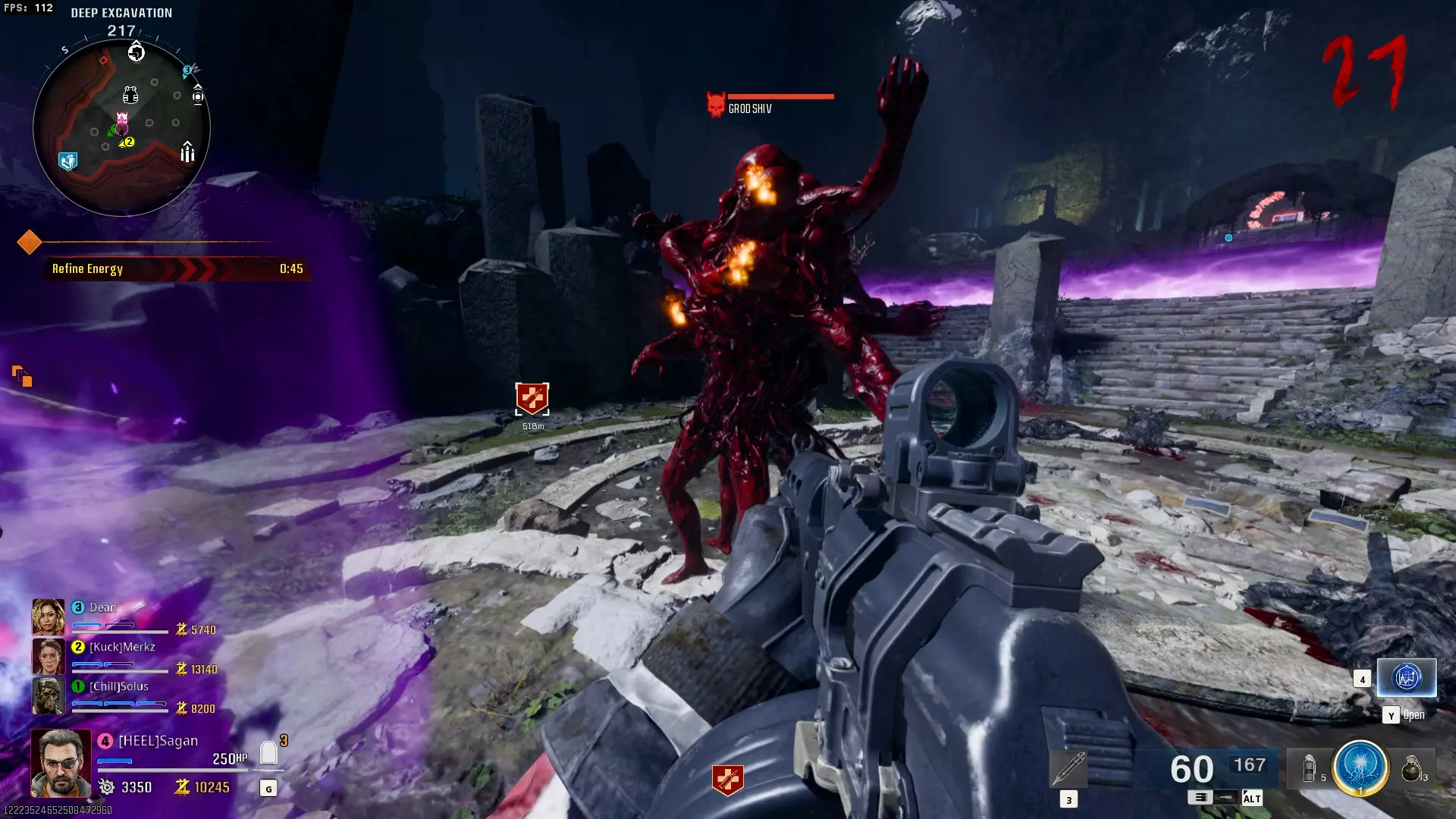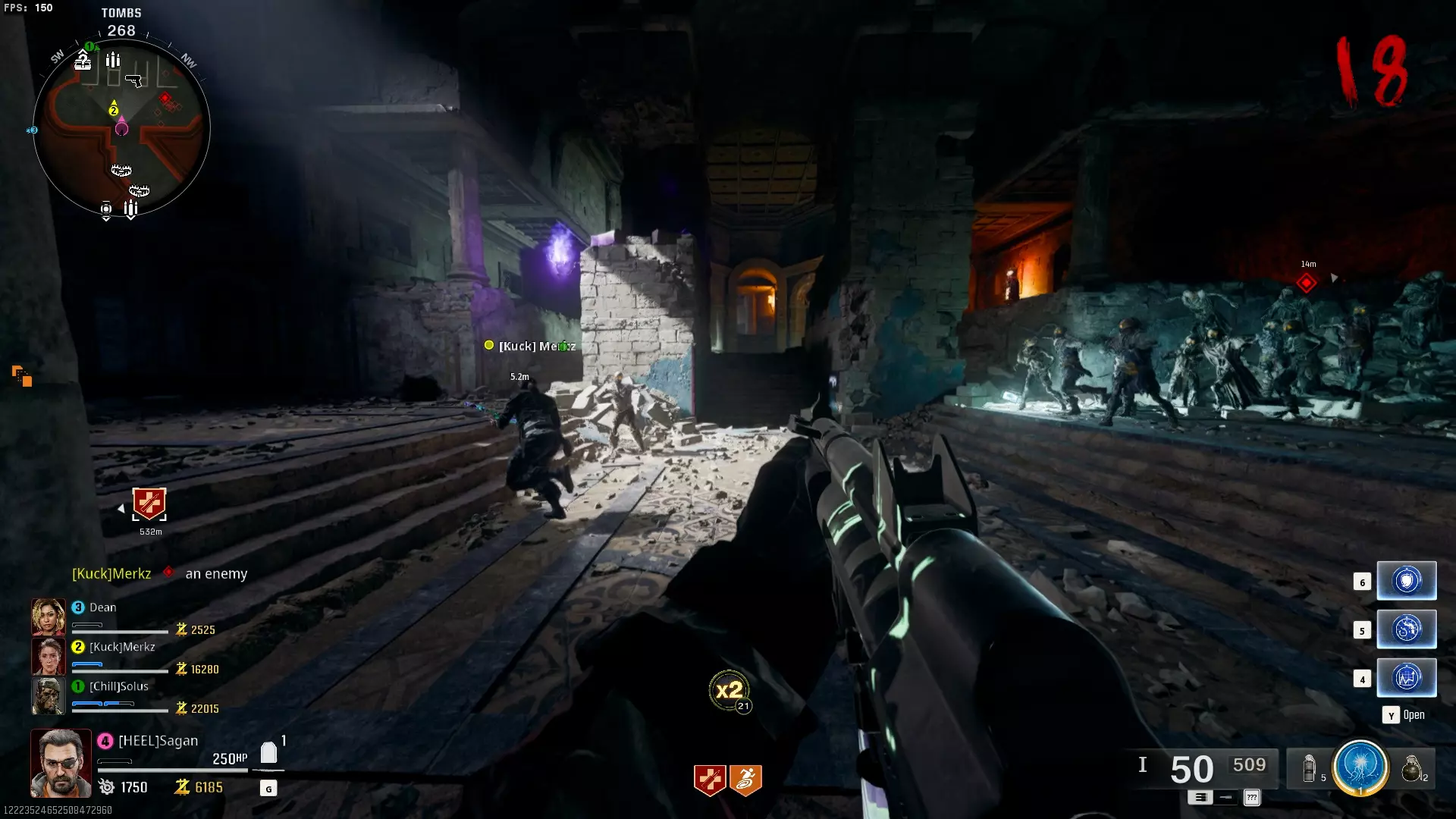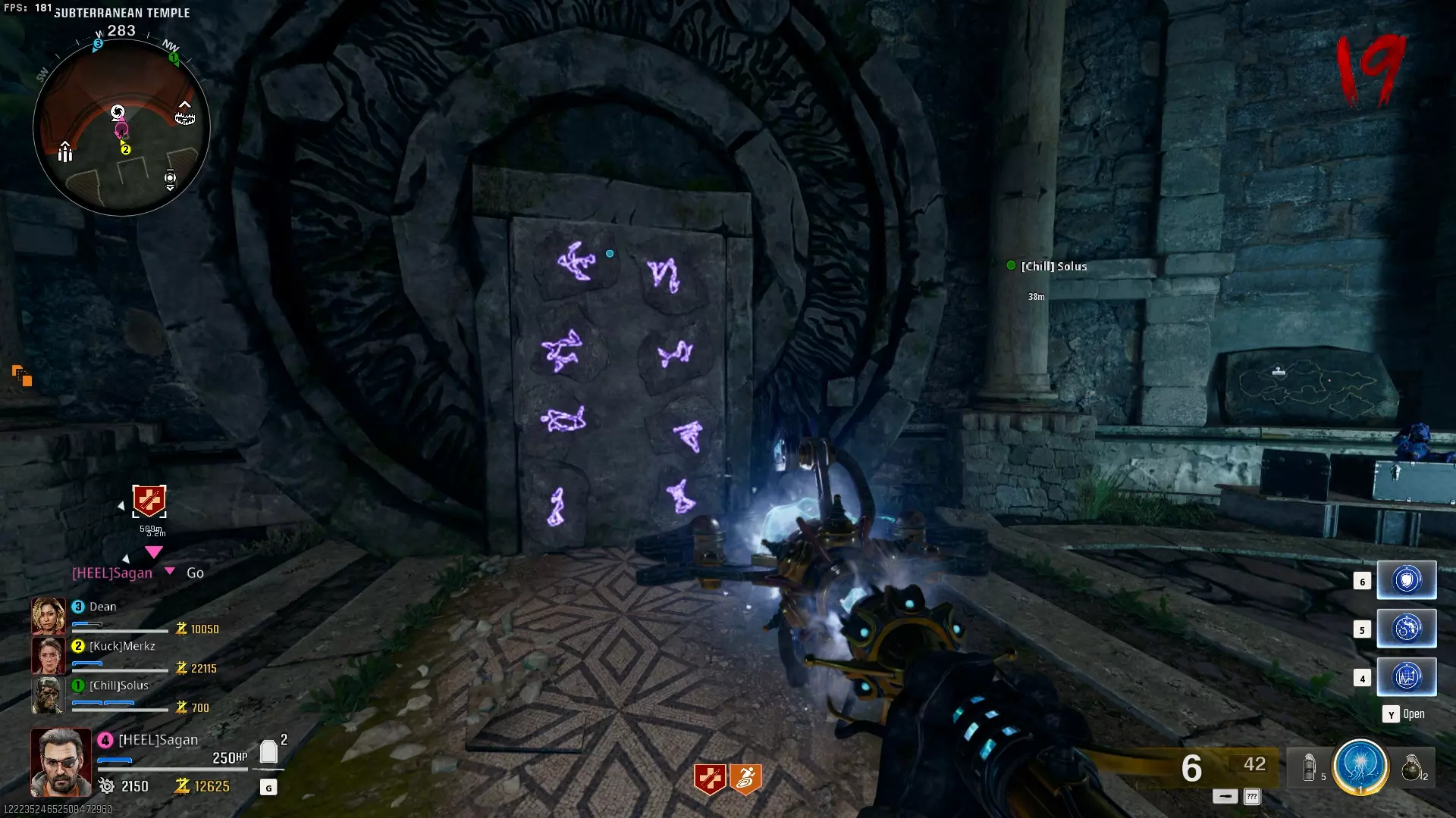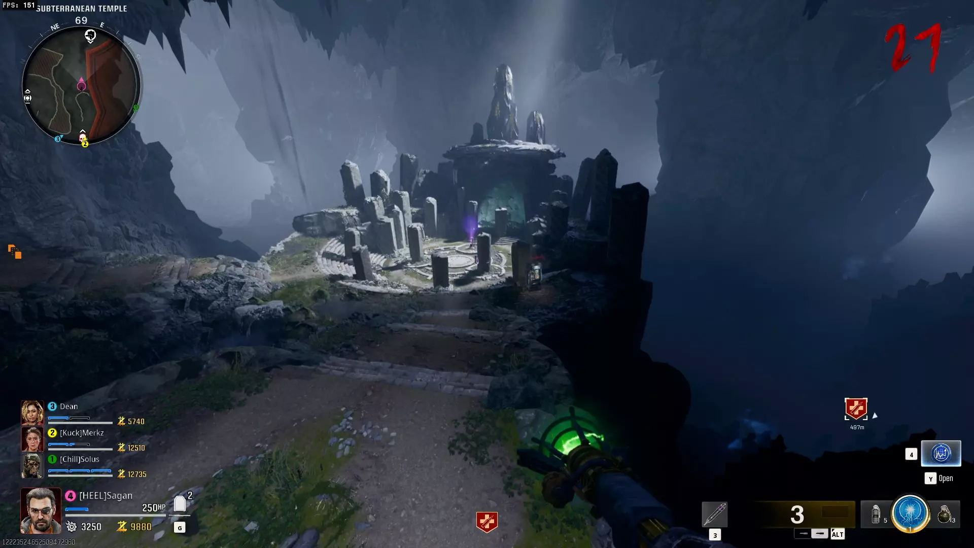 与紫色球体互动后跳下。【注意:此部分略带难度且较为繁琐。】 与球体互动后,它会漂浮下降并在移动时生成僵尸。你/玩家需要做的是紧跟球体,同时射击/消灭不断生成的僵尸,直到球体完全绕完整个“黑暗以太枢纽”竞技场,最终进入神殿中央。