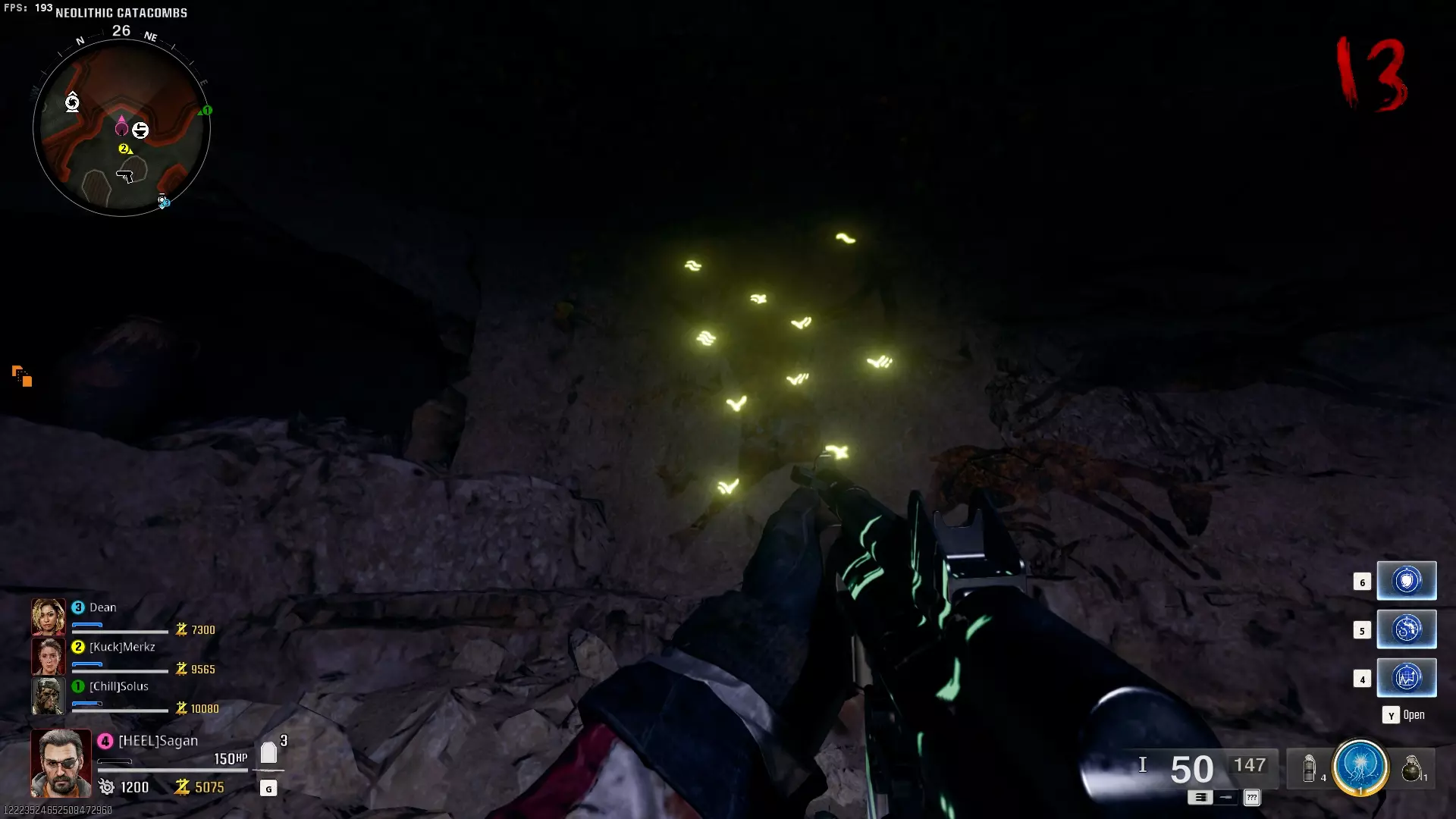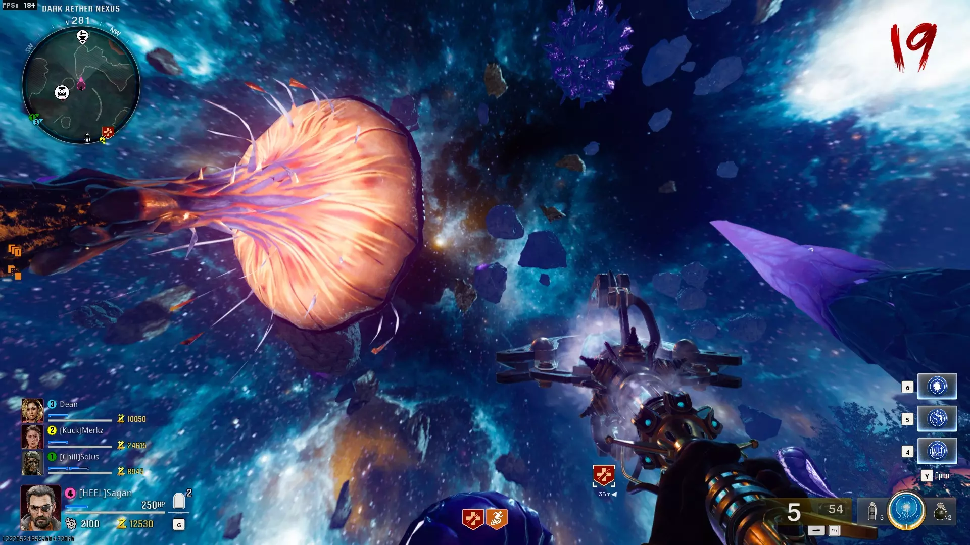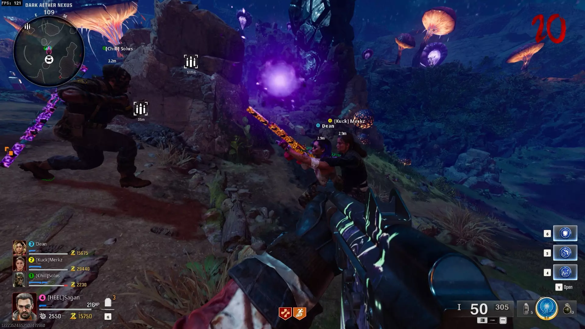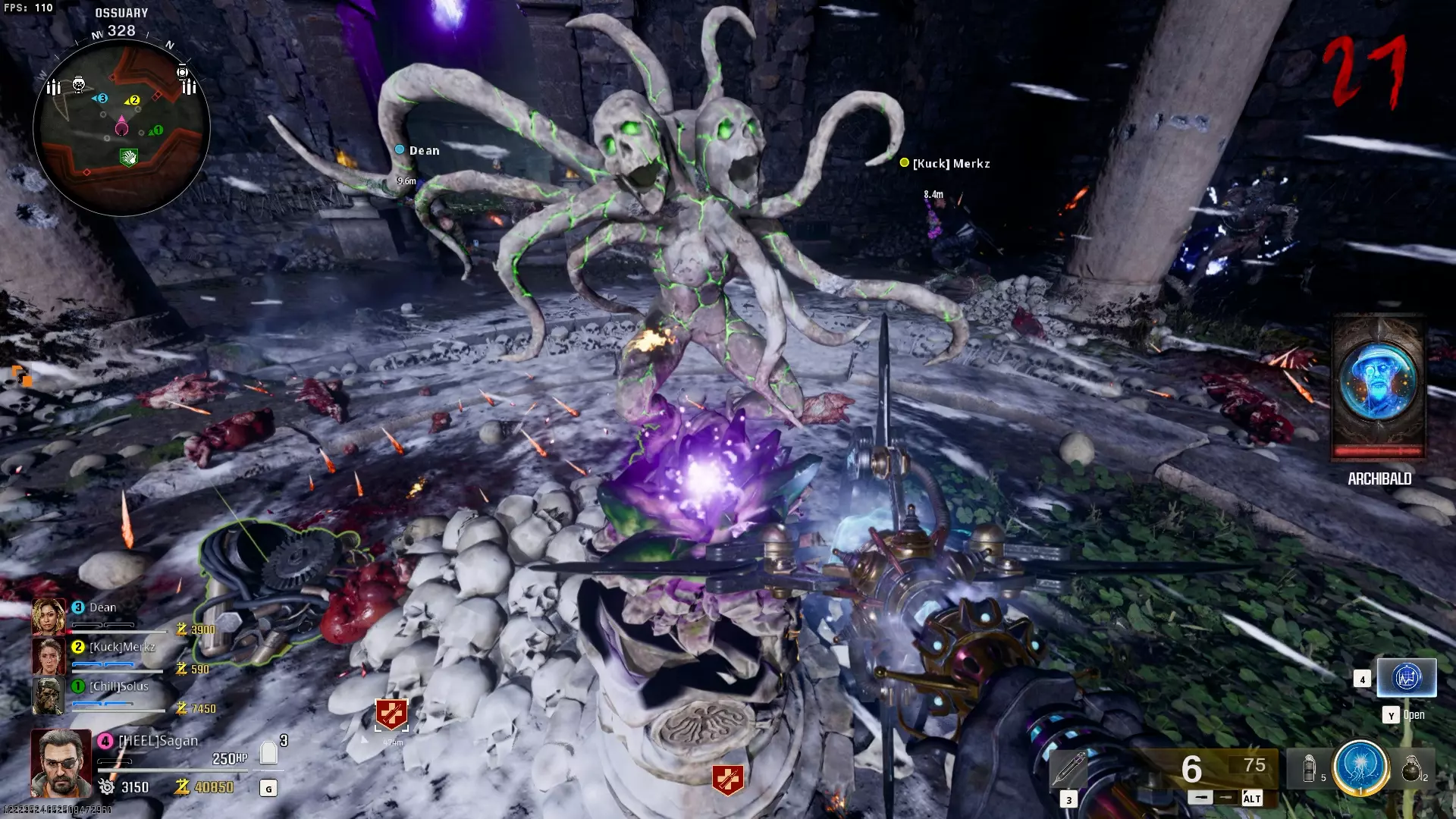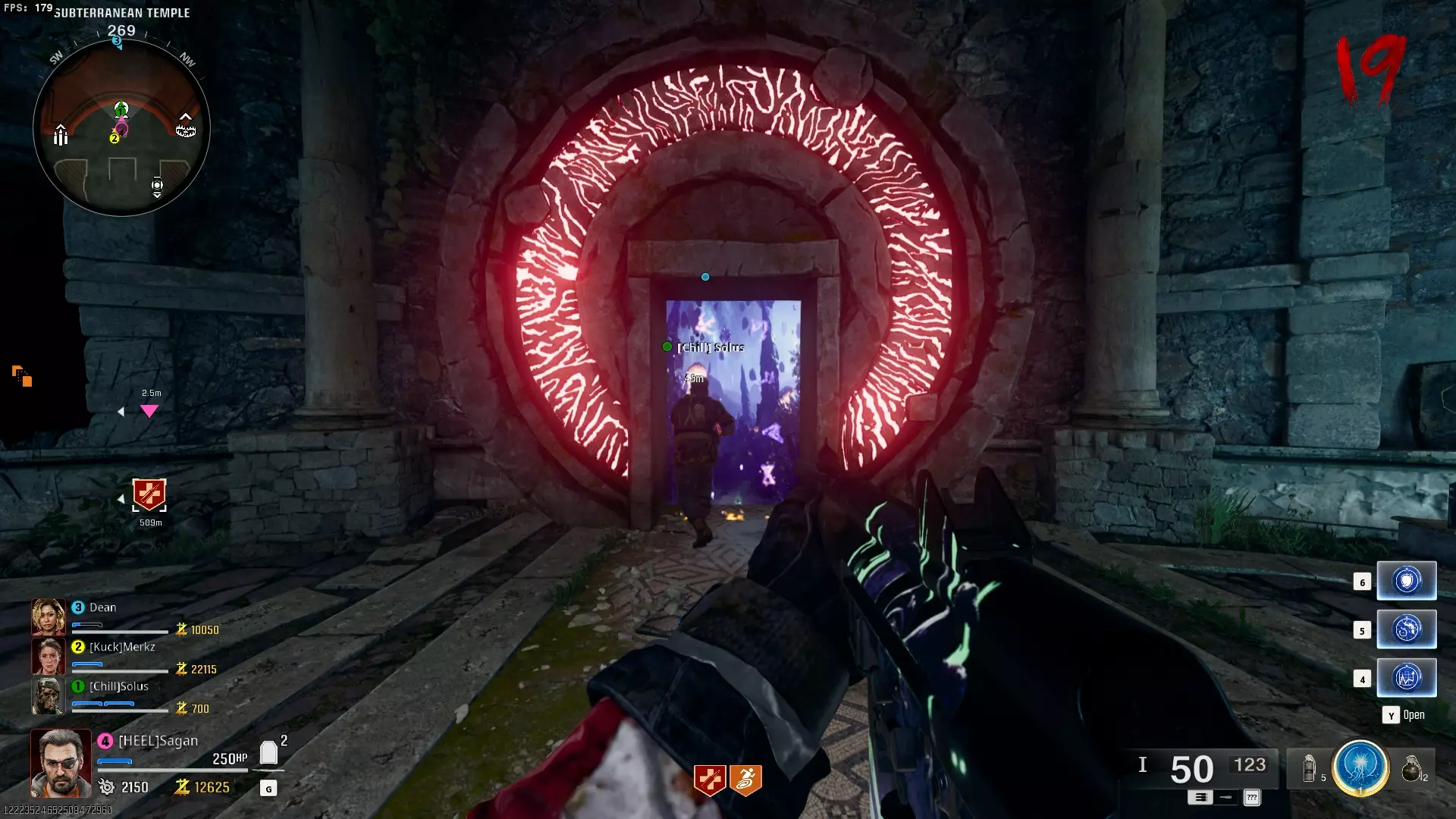 与紫色球体互动后跳下。【注意:此部分略带难度且较为繁琐。】 与球体互动后,它会漂浮下降并在移动时生成僵尸。你/玩家需要做的是紧跟球体,同时射击/消灭不断生成的僵尸,直到球体完全绕完整个“黑暗以太枢纽”竞技场,最终进入神殿中央。