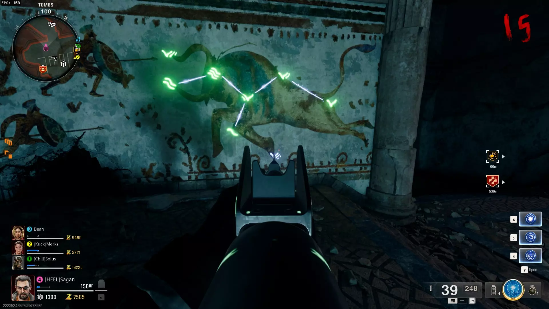 按正确数字顺序射击一次后,会出现一个紫色球体,随后开始区域封锁并生成僵尸。你需要击杀这些僵尸,完成后可获得冰法杖的【头部部件】。