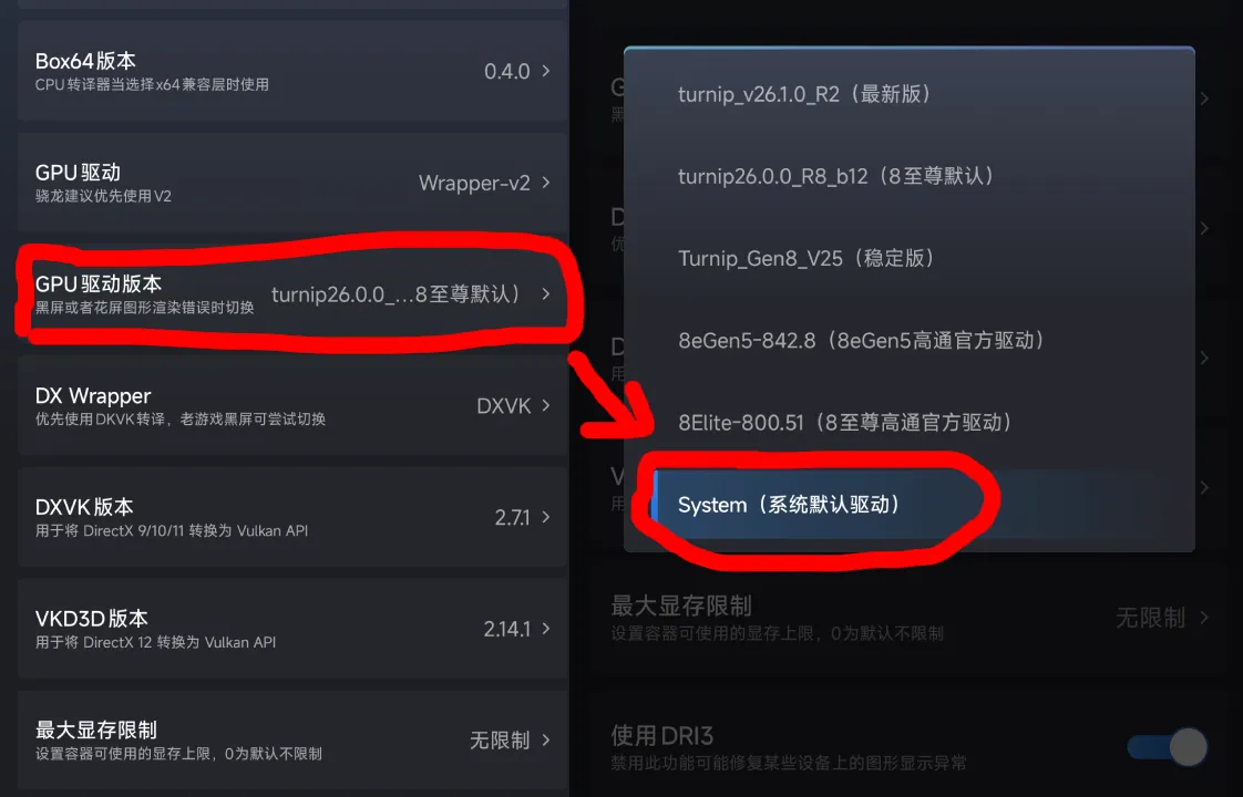 8Gen5 (8 Elite) 芯片,进游戏出现严重花屏/马赛克:请尝试切换GPU驱动版本为 System。