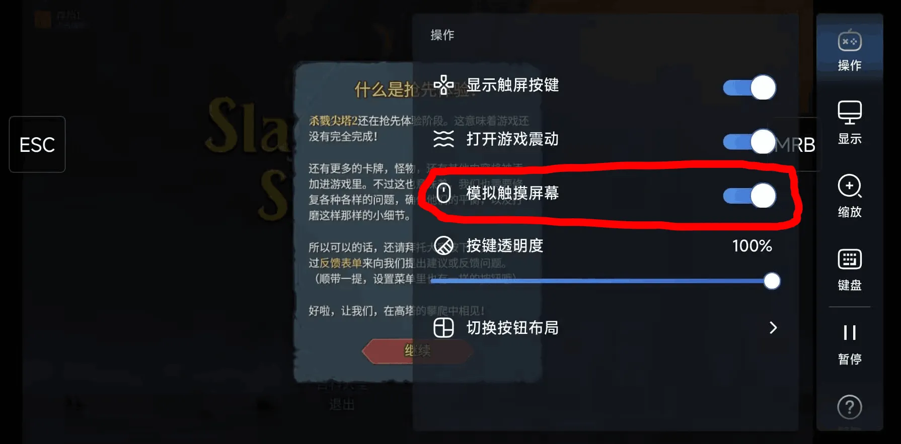 操作方法: 请打开虚拟按键,并选用带有鼠标右键的布局。后续更新会加入翻转右键功能。