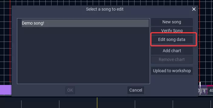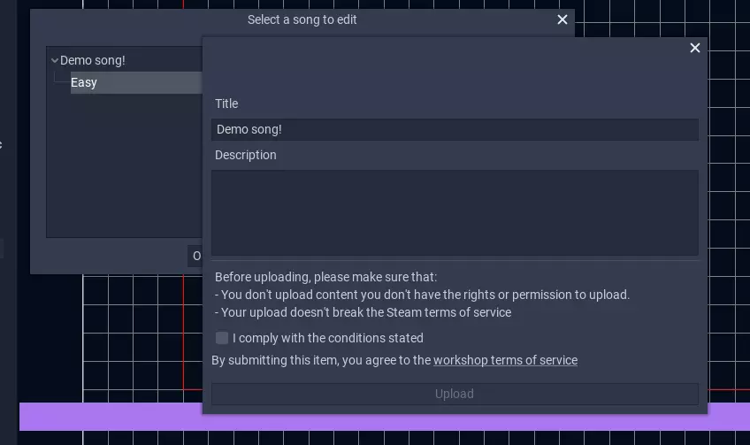 上传至创意工坊非常简单,只需在编辑器的歌曲选择对话框中选择歌曲,然后点击【上传至创意工坊】。如果你的歌曲没有需要预先解决的问题,就会弹出一个窗口,你可以在其中输入一些基本信息。
