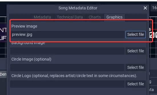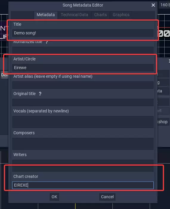 将打开一个新窗口,在那里你可以找到一系列标签页,每个标签页都相当重要,它们的顺序如下: 元数据:歌曲的基本信息,例如歌曲标题、作者等。 技术数据:在该部分中,你可以设置影响歌曲播放方式的数据。 谱面:这能让你启用和禁用三种内置难度的谱面。 图形:该部分用于设置歌曲的视觉方面,例如背景图片、预览图片以及其他一些信息。