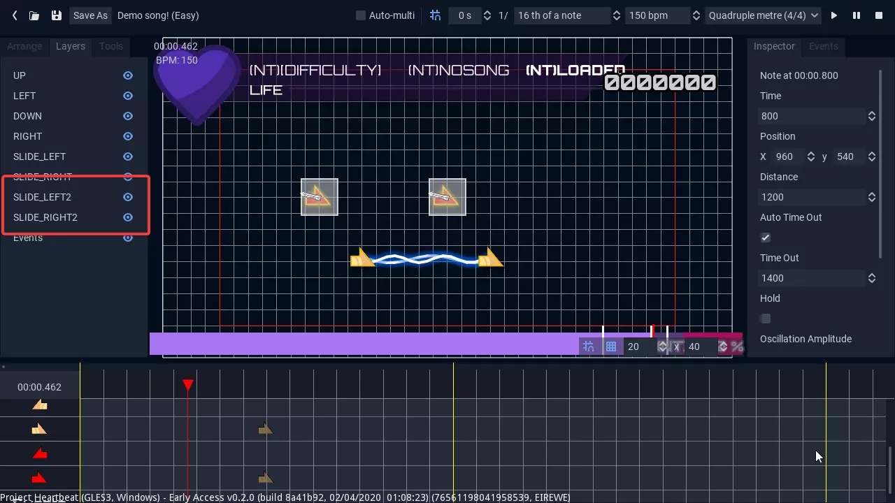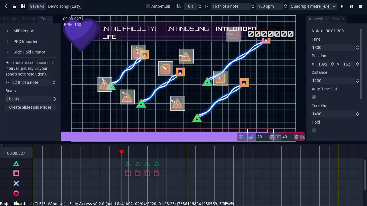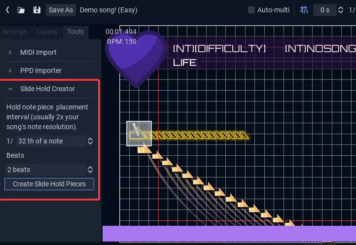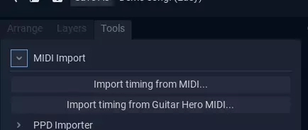 通常在创建谱面时,你需要先设置音符的时机,然后在屏幕上定位音符。为方便起见,心跳计划允许你从MIDI文件导入谱面,其中包括针对吉他英雄专用MIDI的选项(这类MIDI比较特殊,会将所有难度编码在单个文件中)。不过,未来最终会推出适用于克隆英雄和osu!谱面的新导入器。 创建同一方向的同时滑动