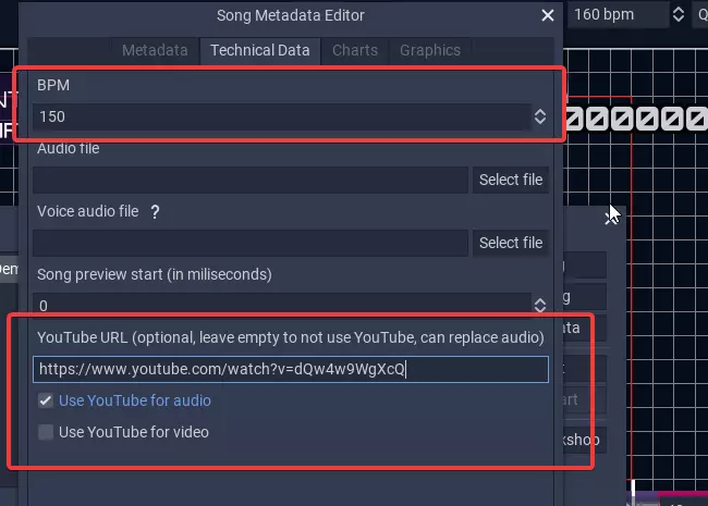 在技术数据选项卡中,我们必须设置BPM(这非常重要,因为游戏的某些方面取决于BPM,我们在此处输入的值将作为歌曲内的基准值,但你可以通过BPM变更事件进行更改,稍后会详细说明)。在我们的示例中,我们将使用一个YouTube视频作为音频来源,不过我们选择不将其用作视频背景。