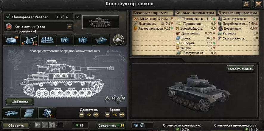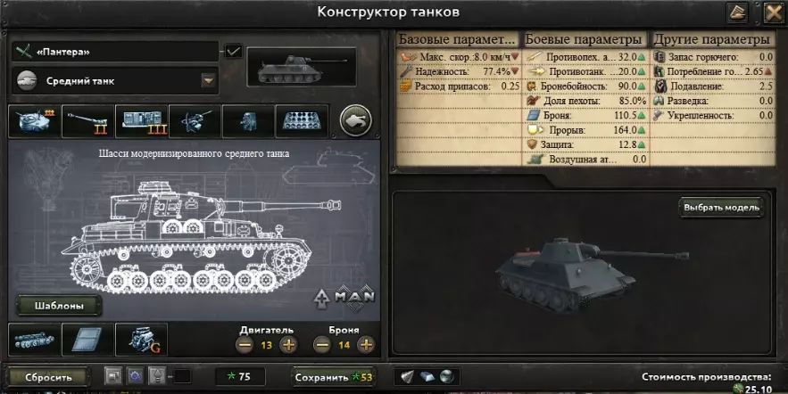 最强且终极的配置。在早期型号上,按优先级安装较旧的模块: 中型火炮2——中型火炮1——直射支援火炮 无线电3——无线电2——无线电1 湿式弹药架是必需的,但也可以替换为易维护性。稳定器——装甲裙板——重机枪 自动装弹机——烟雾弹——重机枪 只有在游戏初期,当你的工业实力还不是很强时,才会将焊接装甲更换为铆接装甲。 保留汽油发动机。 保留交错式负重轮布局。 在装甲和发动机方面,要确保可靠性超过75,速度超过7。 火焰喷射坦克