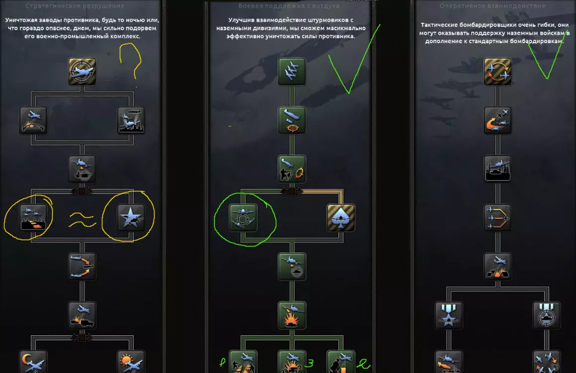 简而言之,所有主要国家有1种学说,其他国家有2种学说。黄色部分标注了多人游戏的可能发展路径。 空军学说