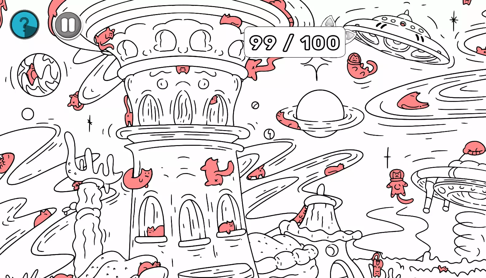 第2关 注意: 1) 最后一只猫在红色圆圈里。 2) 还有一只猫藏在计数条后面。 左侧