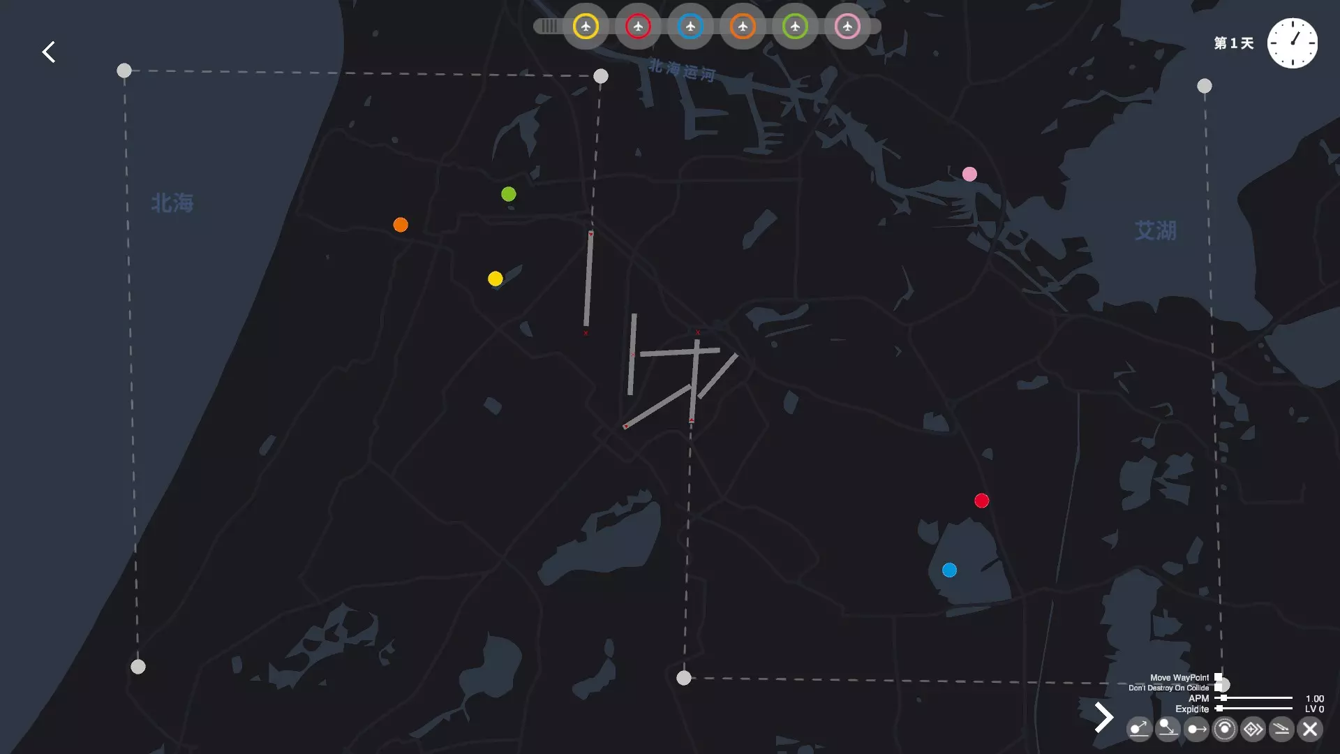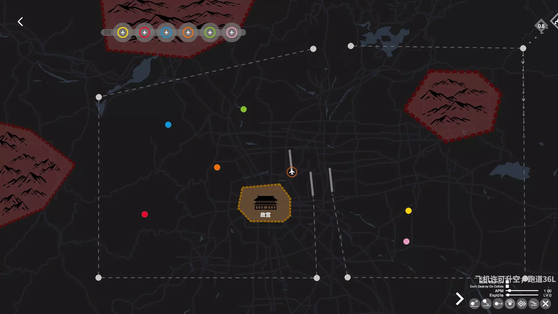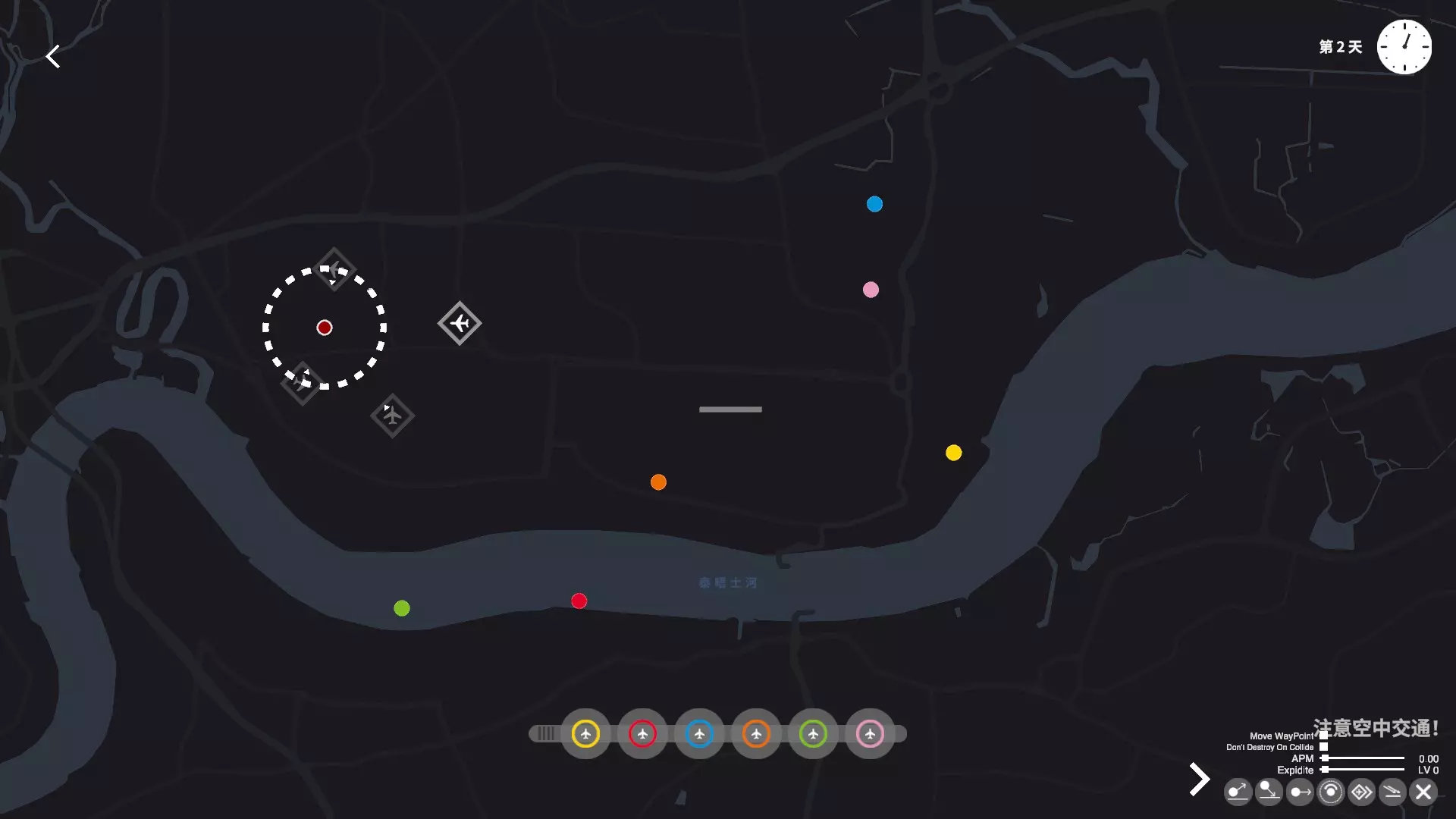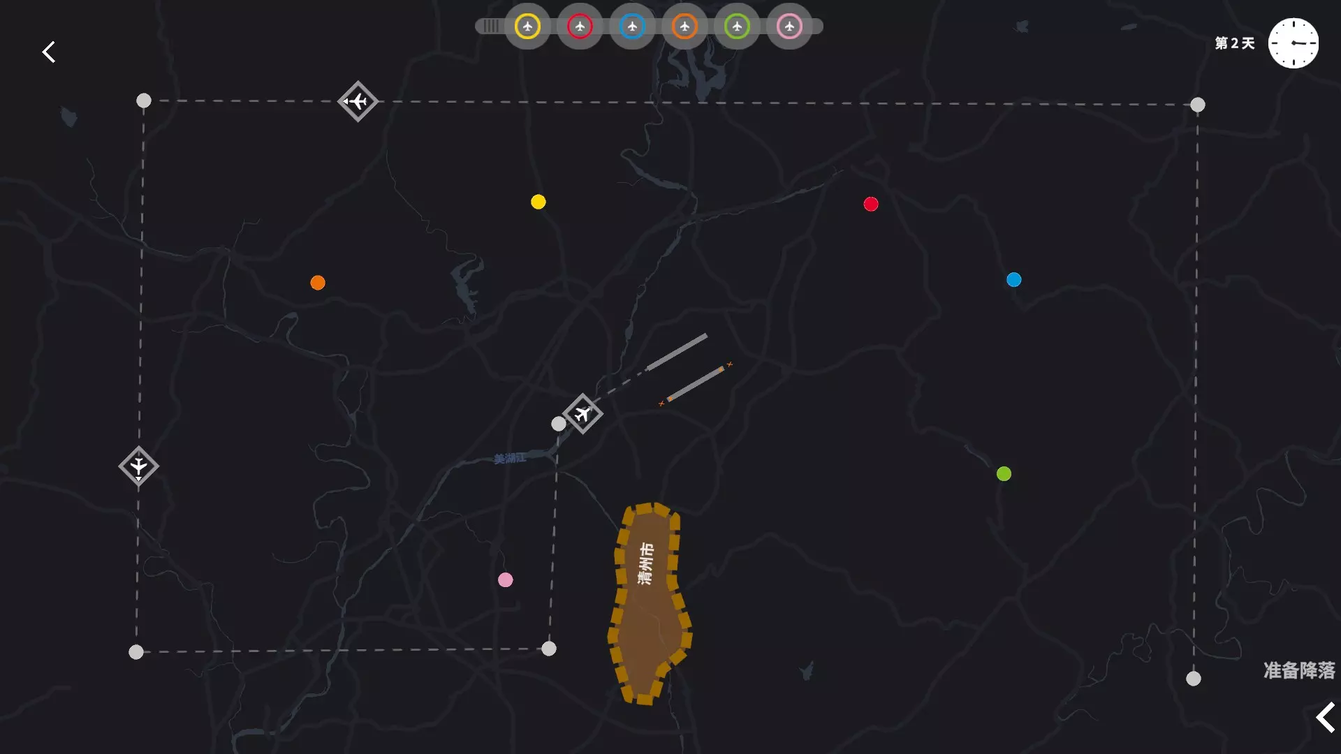 试着把飞机引导到航线上自动起飞降落吧 2. 盘旋点:容错道具,后期必用,高分必用,成就必用。在飞机尚未完全进入盘旋点时就已不可碰撞,可利用此特性规避即将碰撞的飞机。进入盘旋点的飞机显示为灰色,代表不可碰撞。每个盘旋点可储存三架飞机,中间的红点表示盘旋点已满员。
